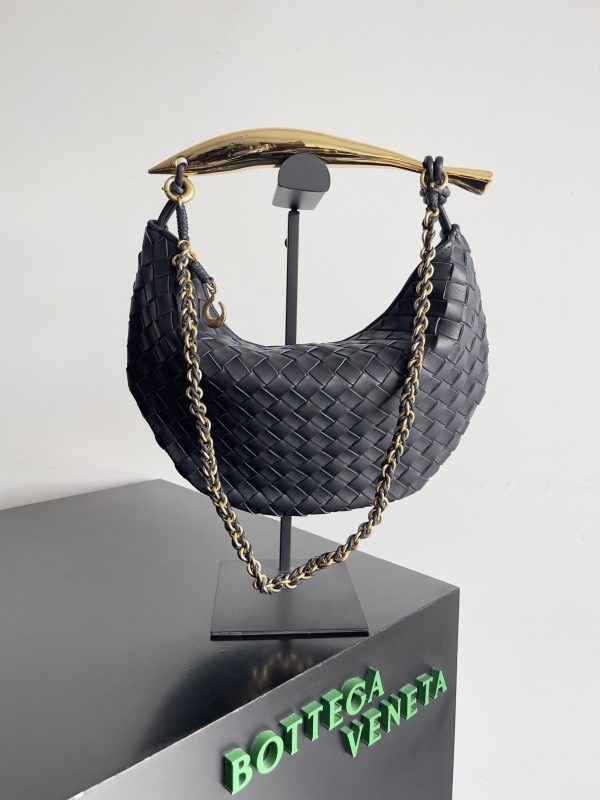 ,Size: Baby,Sculptural metallic top handle, 2″ ,Dimensions: 8″W x 1″D x 4.75″H,Magnetic closure,Signature intrecciato woven leather detailing