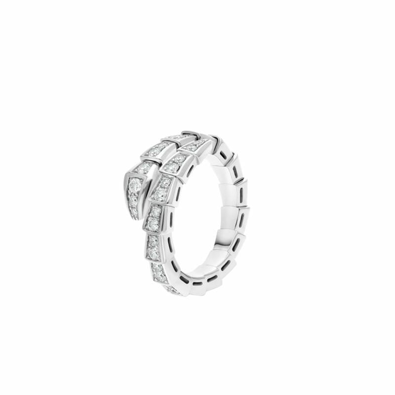 NoneWith its signature blend of pure aesthetics, enveloping shapes and charismatic flair, the Serpenti Viper 18 kt white gold ring with full pavu00efu00bf?diamonds is an essential interpretation of Bvlgariu00efu00bfu00bds icon of endless metamorphosis. Capturing the powerful and ever-evolving nature of the mythical serpent, the magnetic jewellery creation inspires us to embrace change as a source of strength and self-confidence. Easy to mix and match, the ring offers endless styling options, embodying the collectionu00efu00bfu00bds versatile spirit.