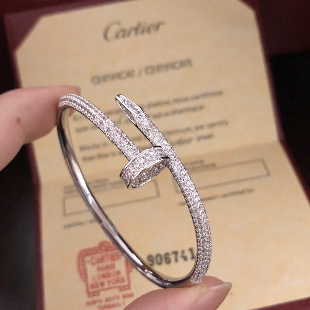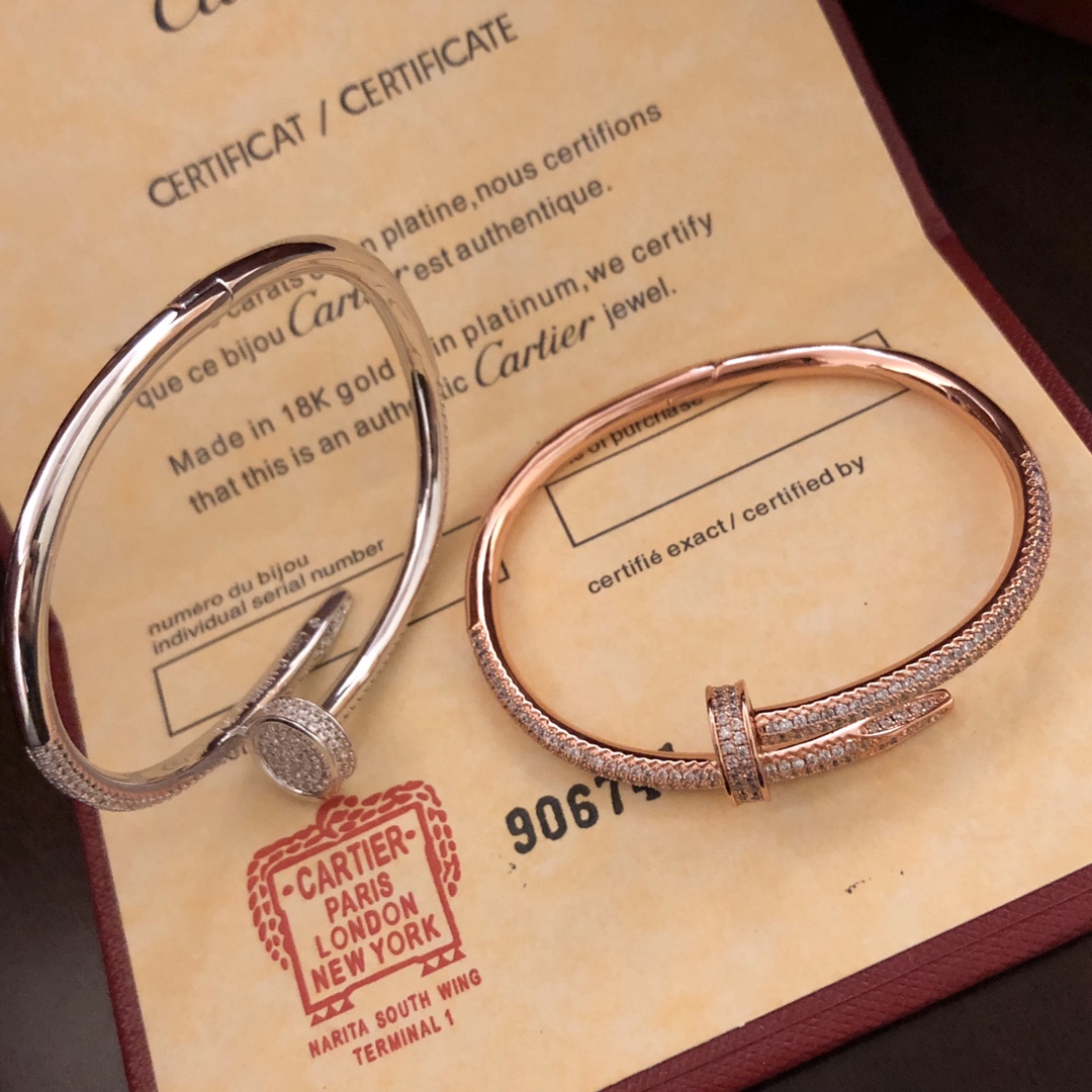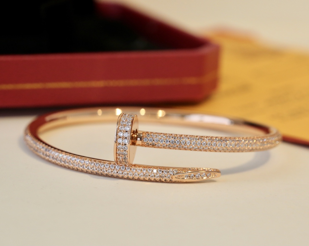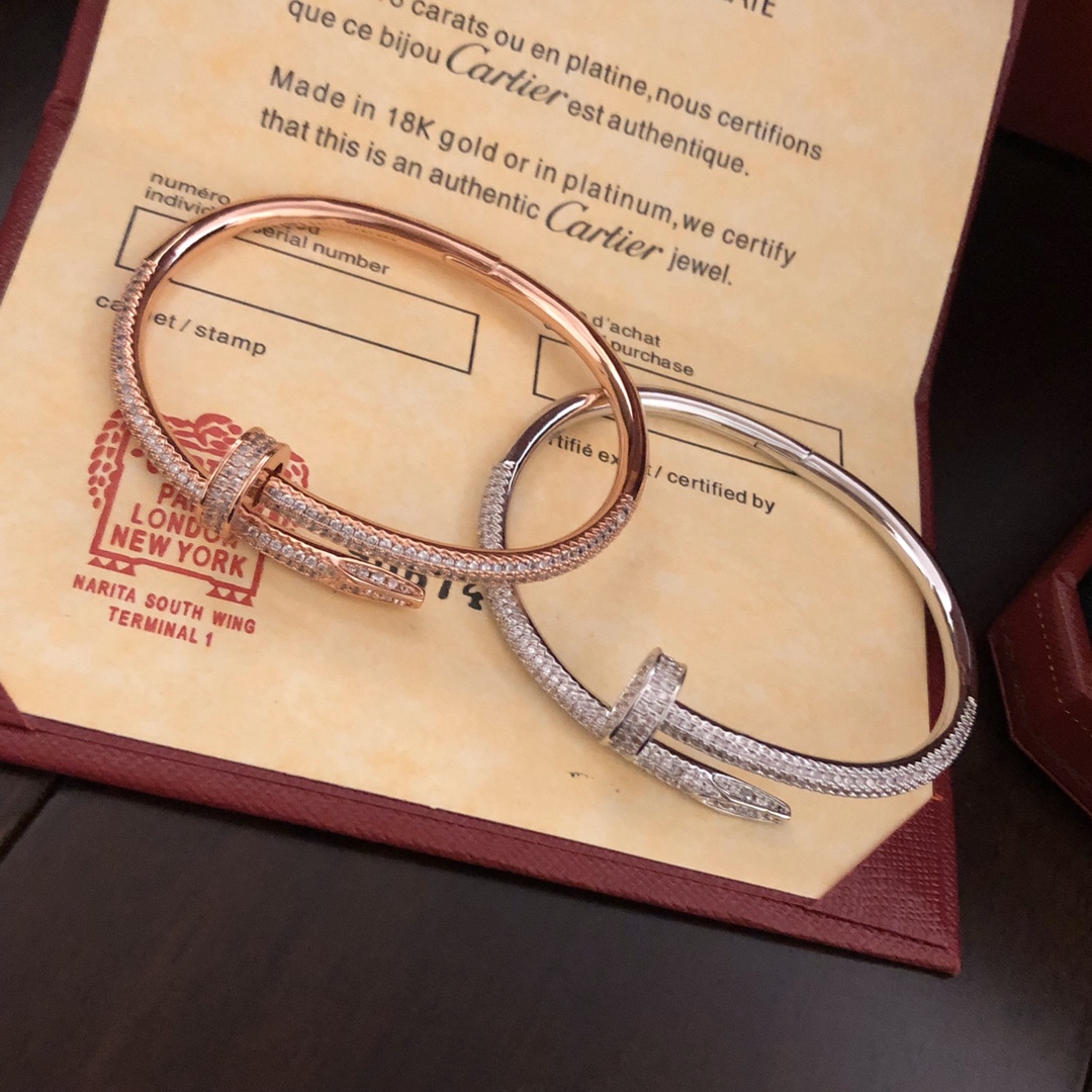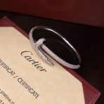 This is a replica of Cartier Juste un Clou bracelet, classic model, half-paved. Coming in 3 colors – White Gold, Pink Gold and Yellow Gold, all bracelets are crafted with the exact same design as the original. Size can be selected when placing order.Product Description:Just un Clou bracelet18K