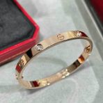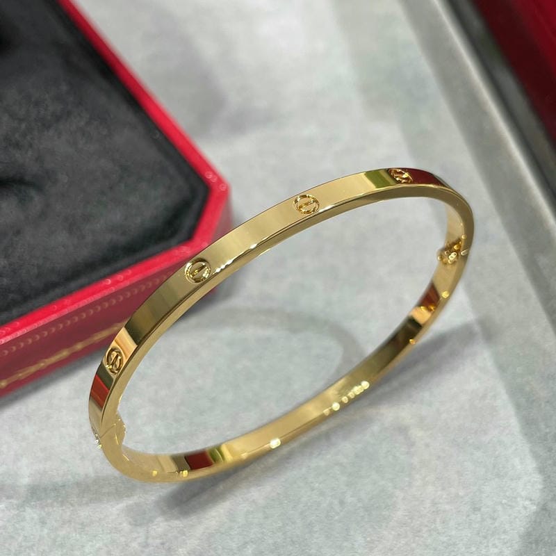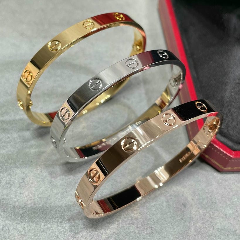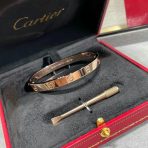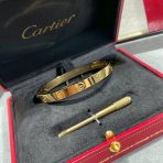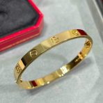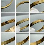 We strive to earn and keep your trust. If we make a mistake, we’ll make it right.nnSize?16/17/18/19nHigh Quality VersionnWith Box nnLOVE bracelet in 750/1000 yellow gold with brushed finish. Screwdriver included. Width: 6.1 mm. The LOVE bracelet, an icon of Cartier jewelry design, was launched in New York in 1969. The two semi-circular hard rings fit together to form an oval bracelet that can be worn on the wrist and requires a screwdriver to remove it. The closure mechanism consists of two functional screws located on each side of the bracelet. Assistance is required to open and close the bracelet. To determine the size of your LOVE bracelet, measure the circumference of your wrist. If you prefer a snug fit, add 1 cm to the circumference of your wrist; if you prefer a loose fit, add 2 cm to the circumference of your wrist.nDepending on the size of the piece you order, the carat weight of the stones, the number of stones and the size of the piece may vary.