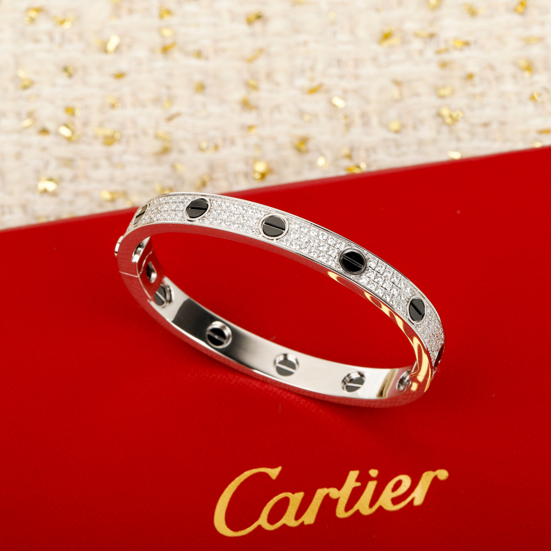 This is a replica of Cartier LOVE bracelet, classic model, paved, ceramic. Coming in 3 colors – White Gold, Rose Gold and Yellow Gold, all bracelets are crafted with the exact same design as the original. Size can be selected when placing order.Product Description:LOVE bracelet18K white/yellow/