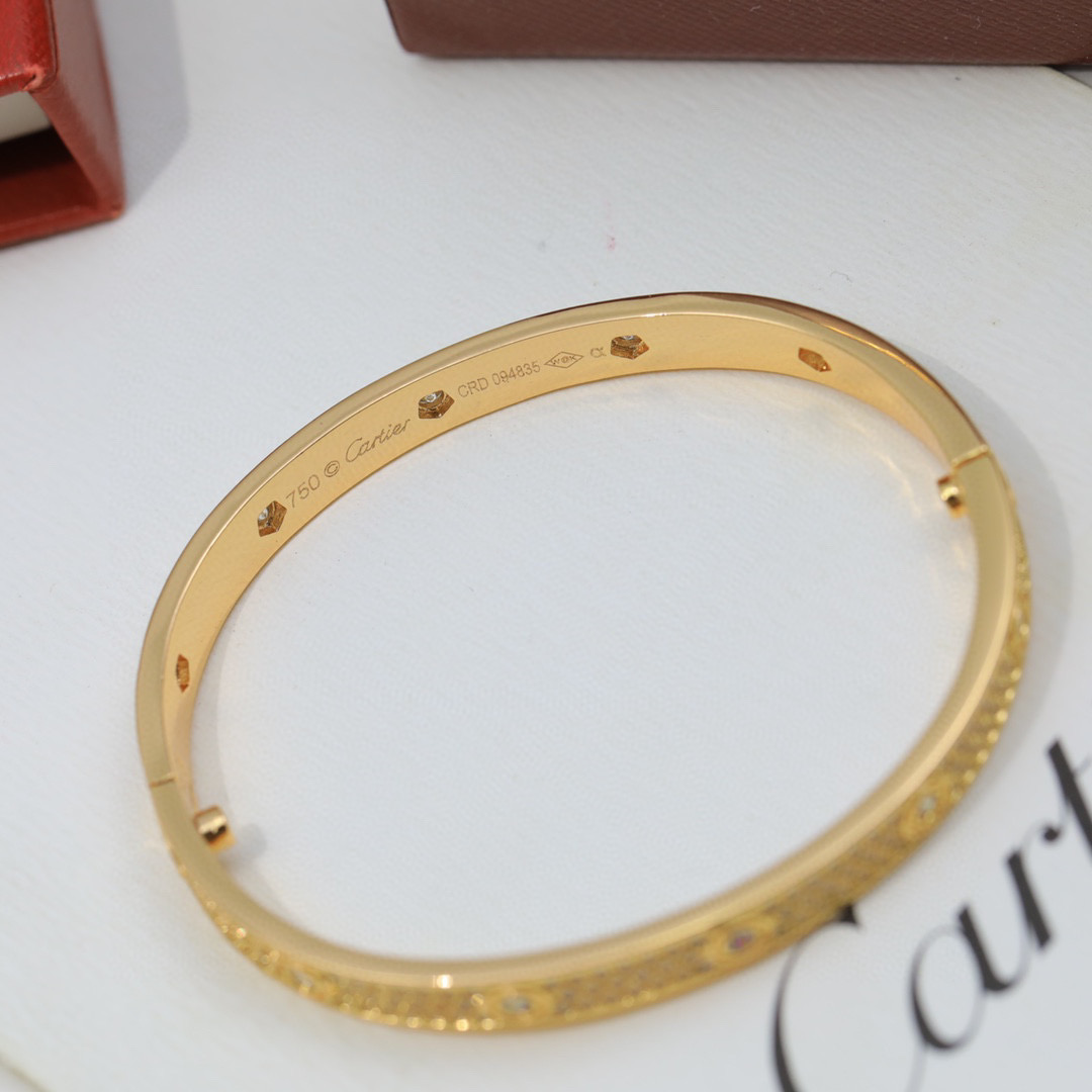 This is a replica of Cartier LOVE bracelet, classic model, paved. Coming in 3 colors – White Gold, Rose Gold and Yellow Gold, all bracelets are crafted with the exact same design as the original. Size can be selected when placing order.Product Description:LOVE bracelet18K white/yellow/rose gold