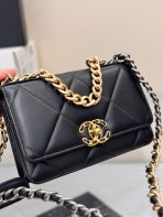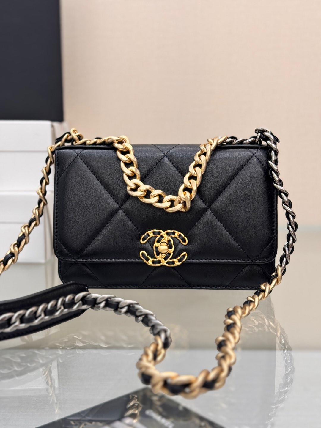This is a replica CHANEL 19 Wallet on Chain Shiny Lambskin, Gold-Tone, Silver-Tone & Ruthenium-Finish Metal in Black . Interlocking CC Logo, Quilted Pattern & Chain-Link Accent.