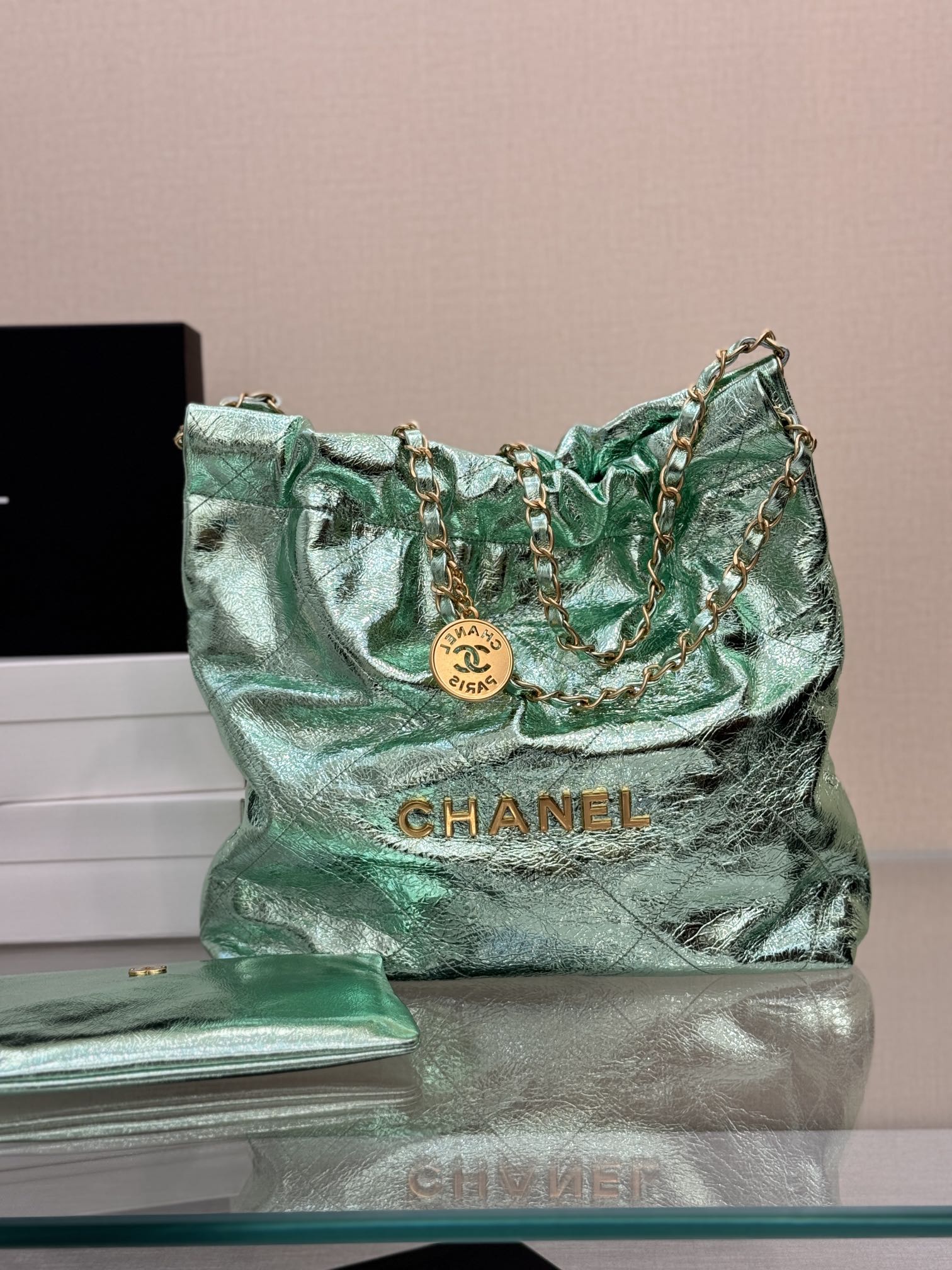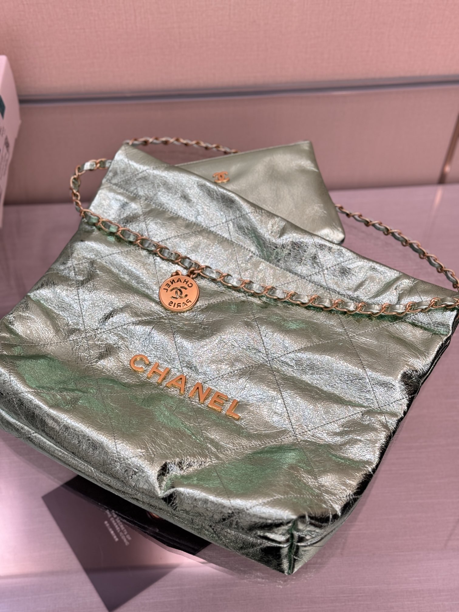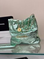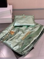 This is a replica CHANEL 22 Mini Handbag Metallic Calfskin & Silver-Tone Metal Green. From the Cruise 2025 Collection by Virginie Viard, this mini 22 bag comes in metal silver,Size,