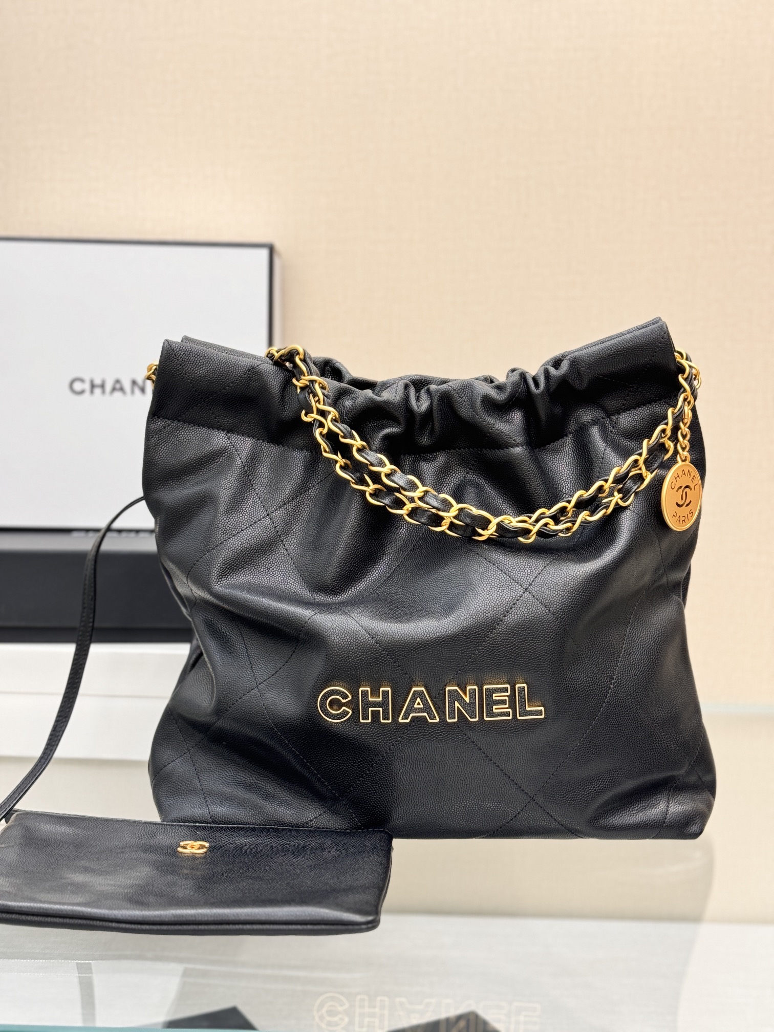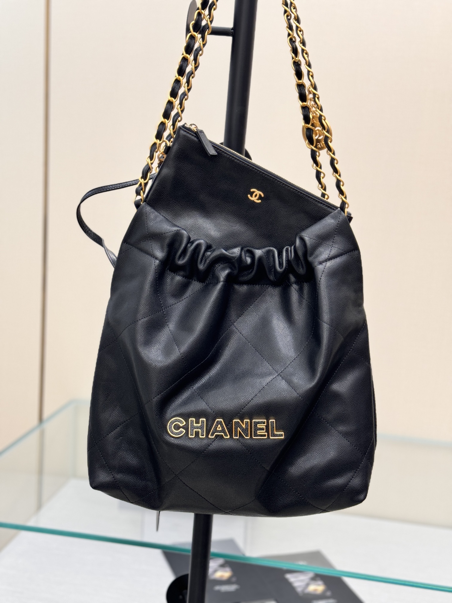 This is a replica CHANEL 22 Small Handbag Shiny Calfskin & Gold-Tone Metal in Black. From the Cruise 2025 Collection by Virginie Viard, this small 22 bag comes in shiny calfskin,,Size: Small ,