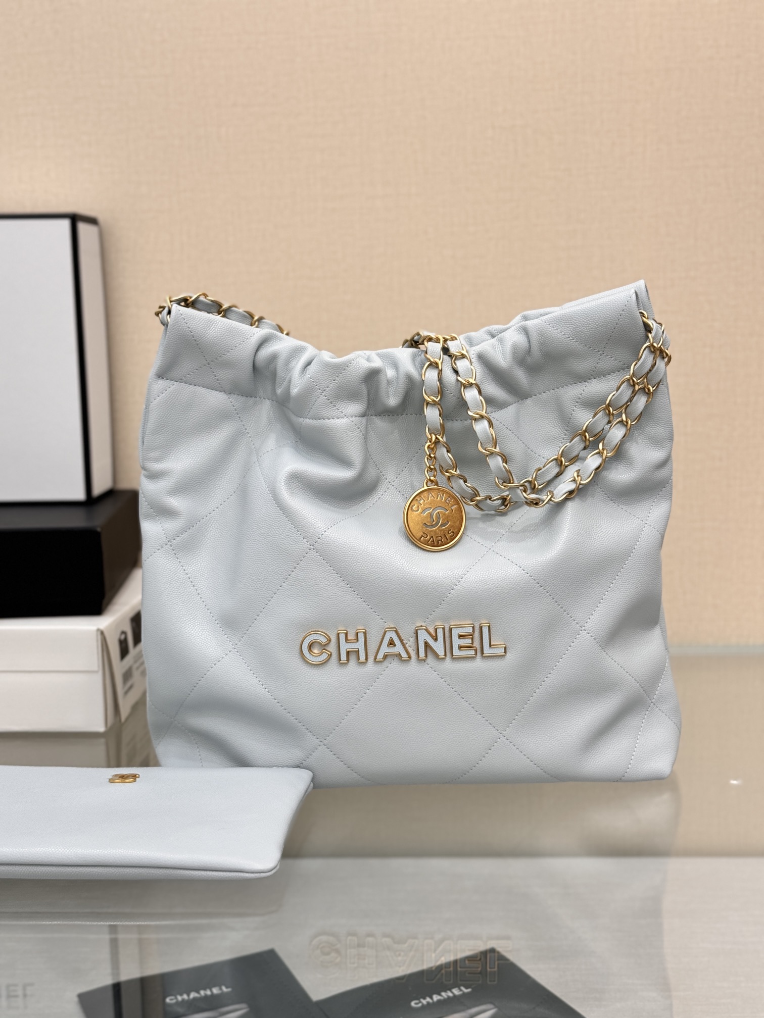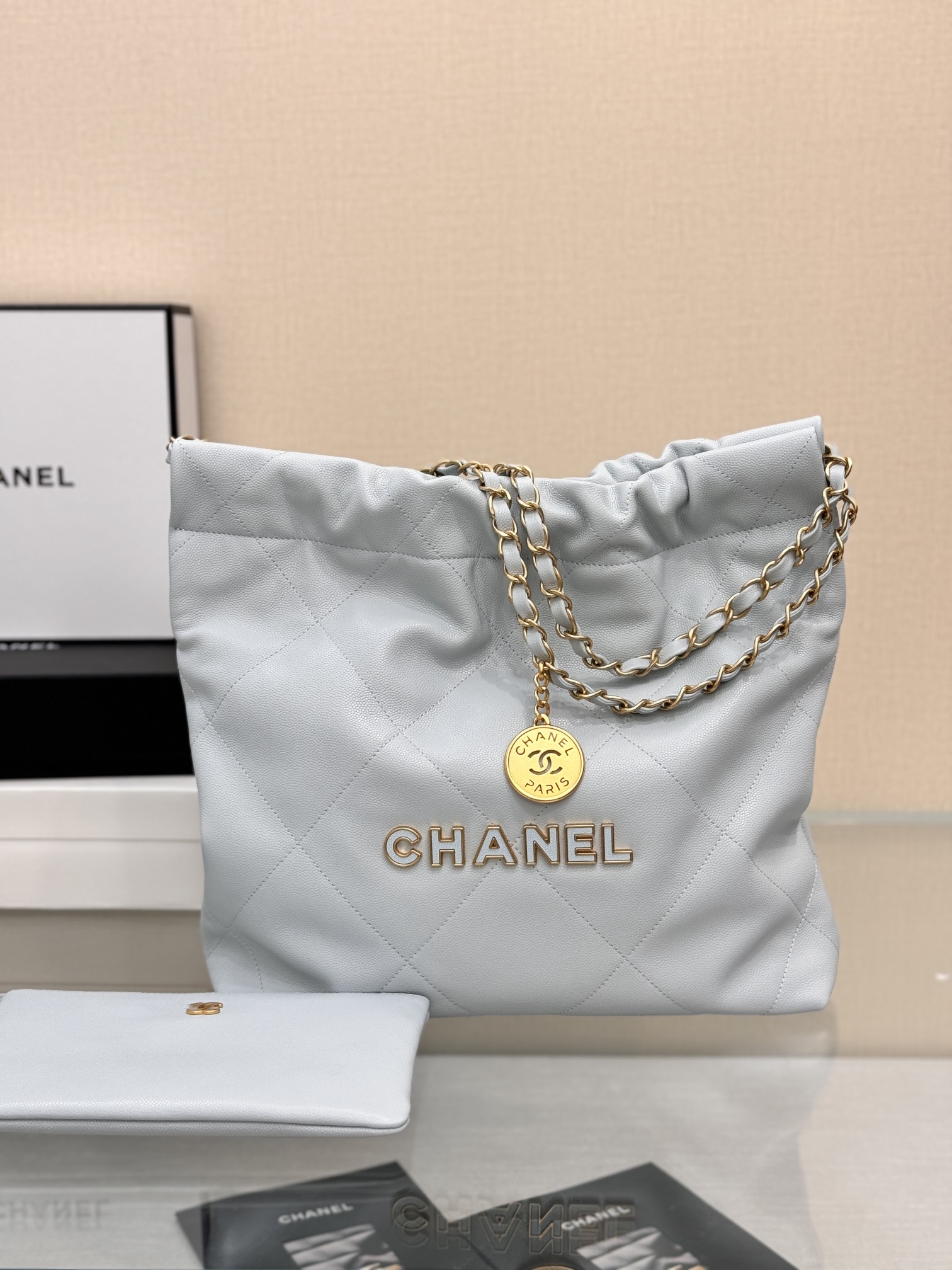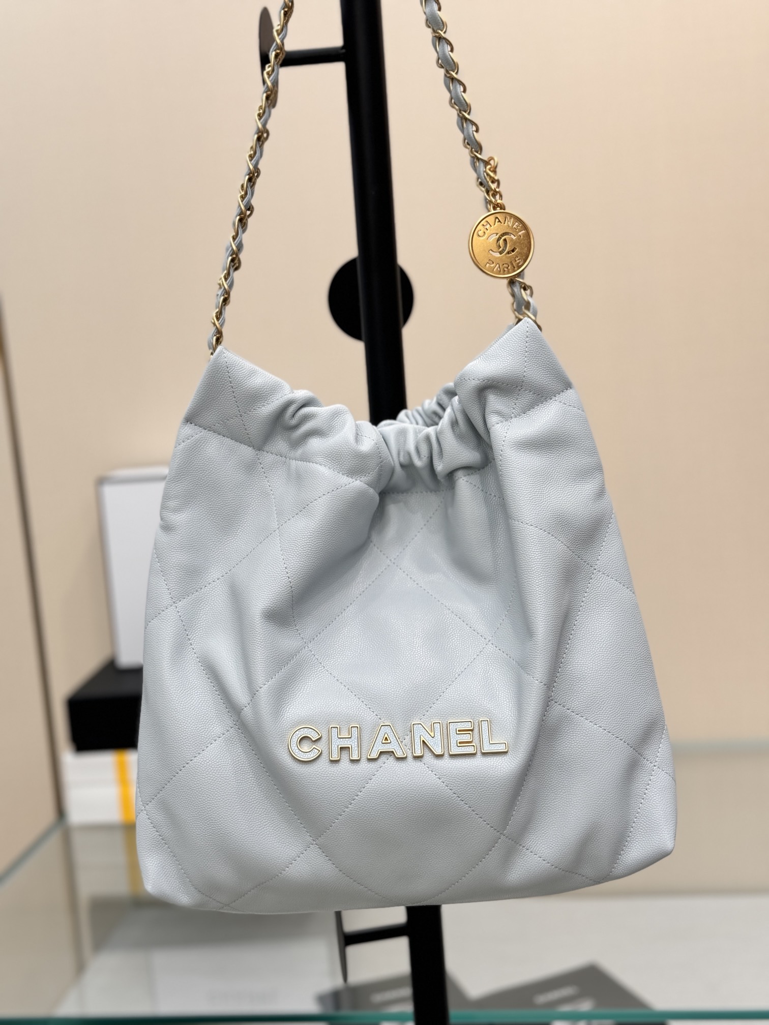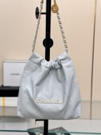 This is a replica CHANEL 22 Small Handbag Shiny Calfskin & Gold-Tone Metal in Light grey. From the Cruise 2025 Collection by Virginie Viard, this , 22 bag comes in shiny calfskin,,Size: Small ,