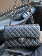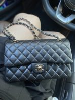 This is a replica CHANEL Classic 11.12 Flap Bag Lambskin & Gold-Tone Metal in Black. This classic double flap bag comes in smooth black lambskin featuring gold-tone hardware. Open pocket on the back. Closes with classic CC-turn-lock on the front. Zipper pocket inside the flap. Outside pocket on the front under the flap. A lipstick pocket against the back. CC stitching on the inside flap. ,Size,