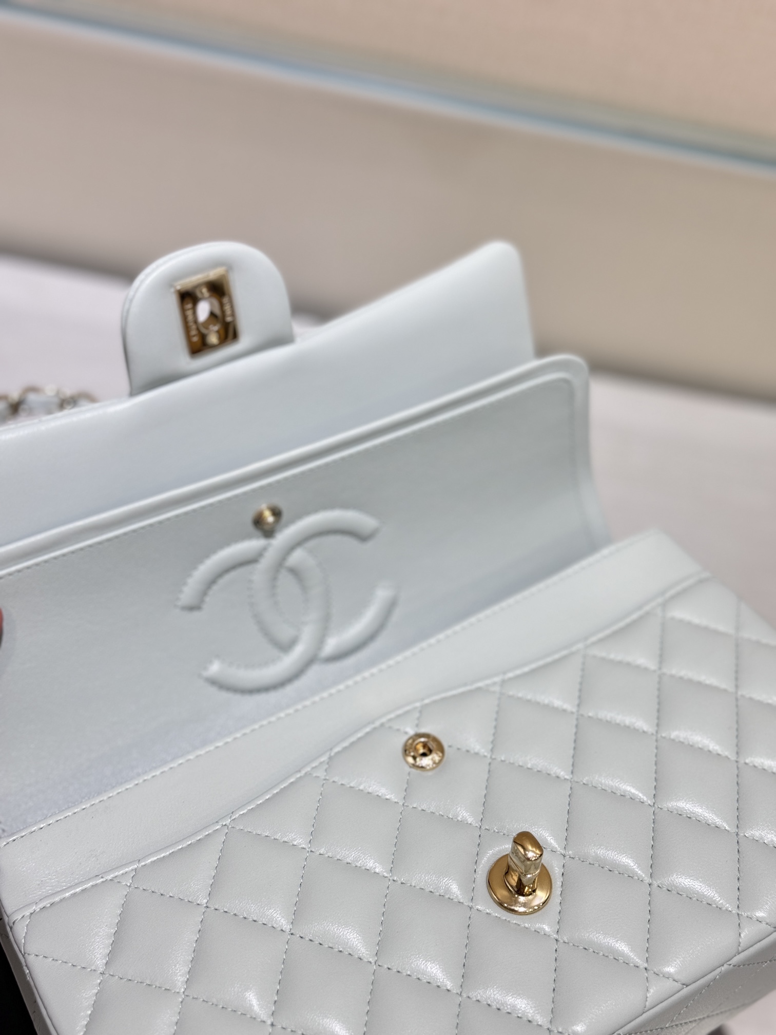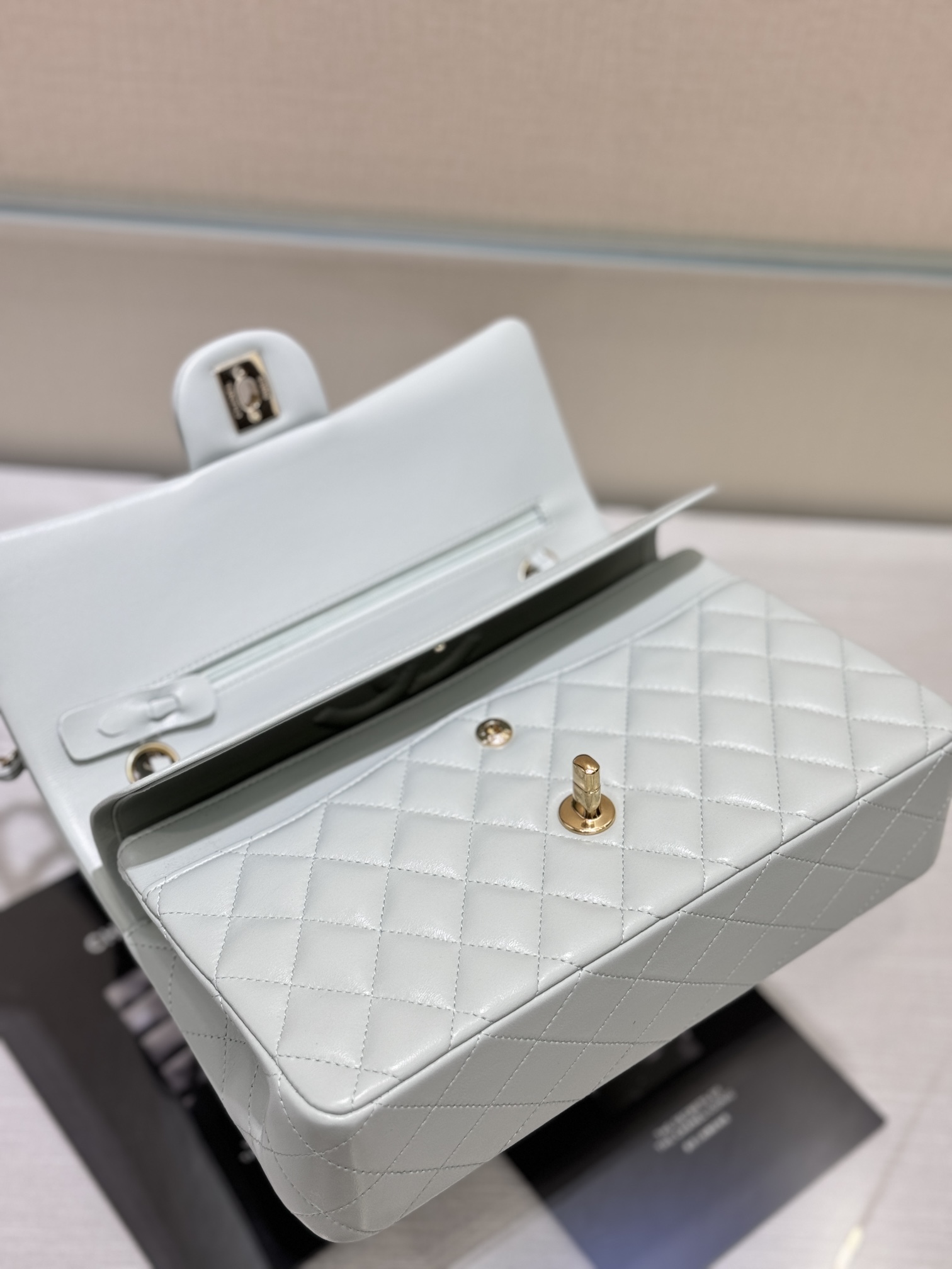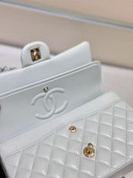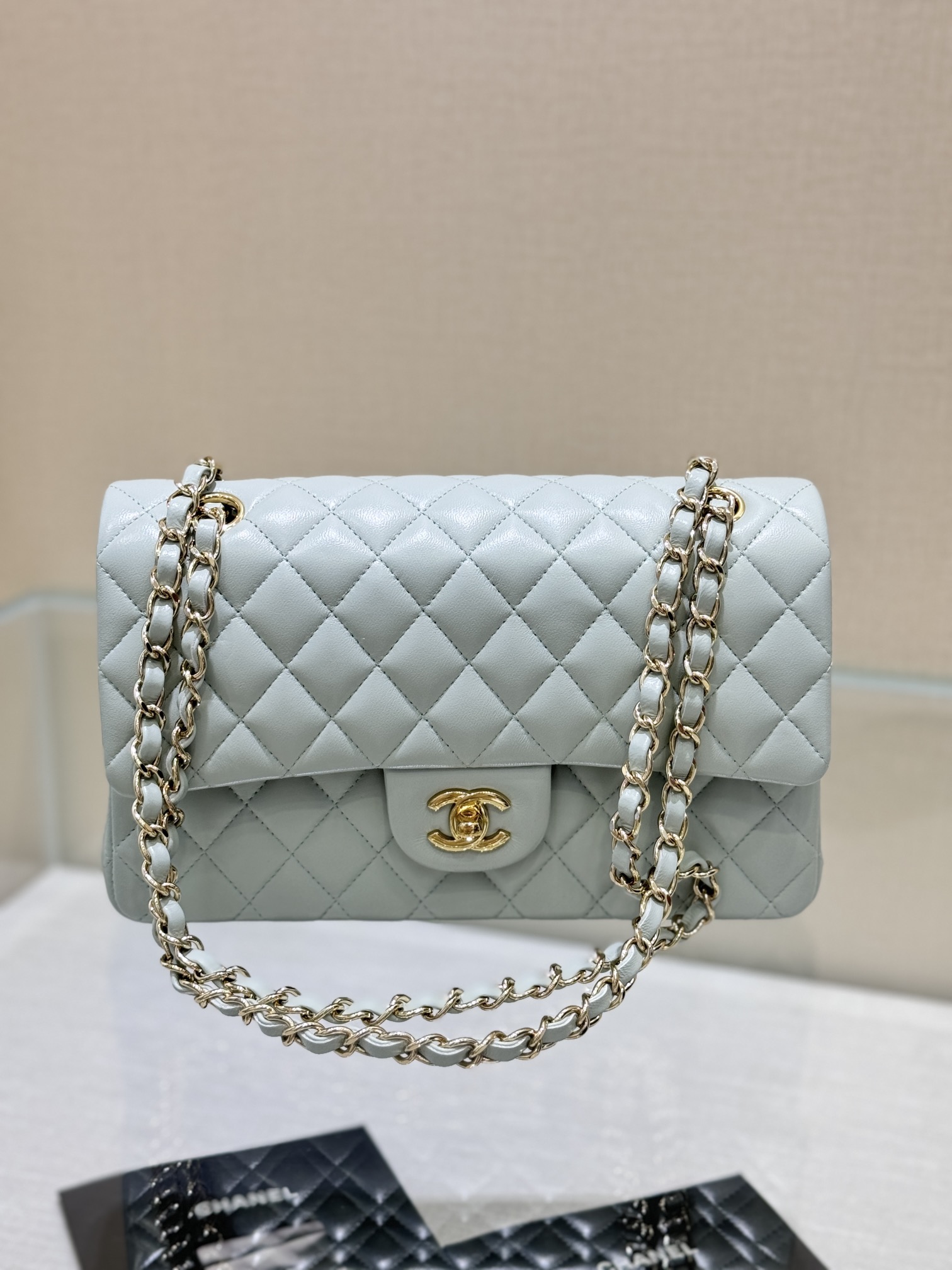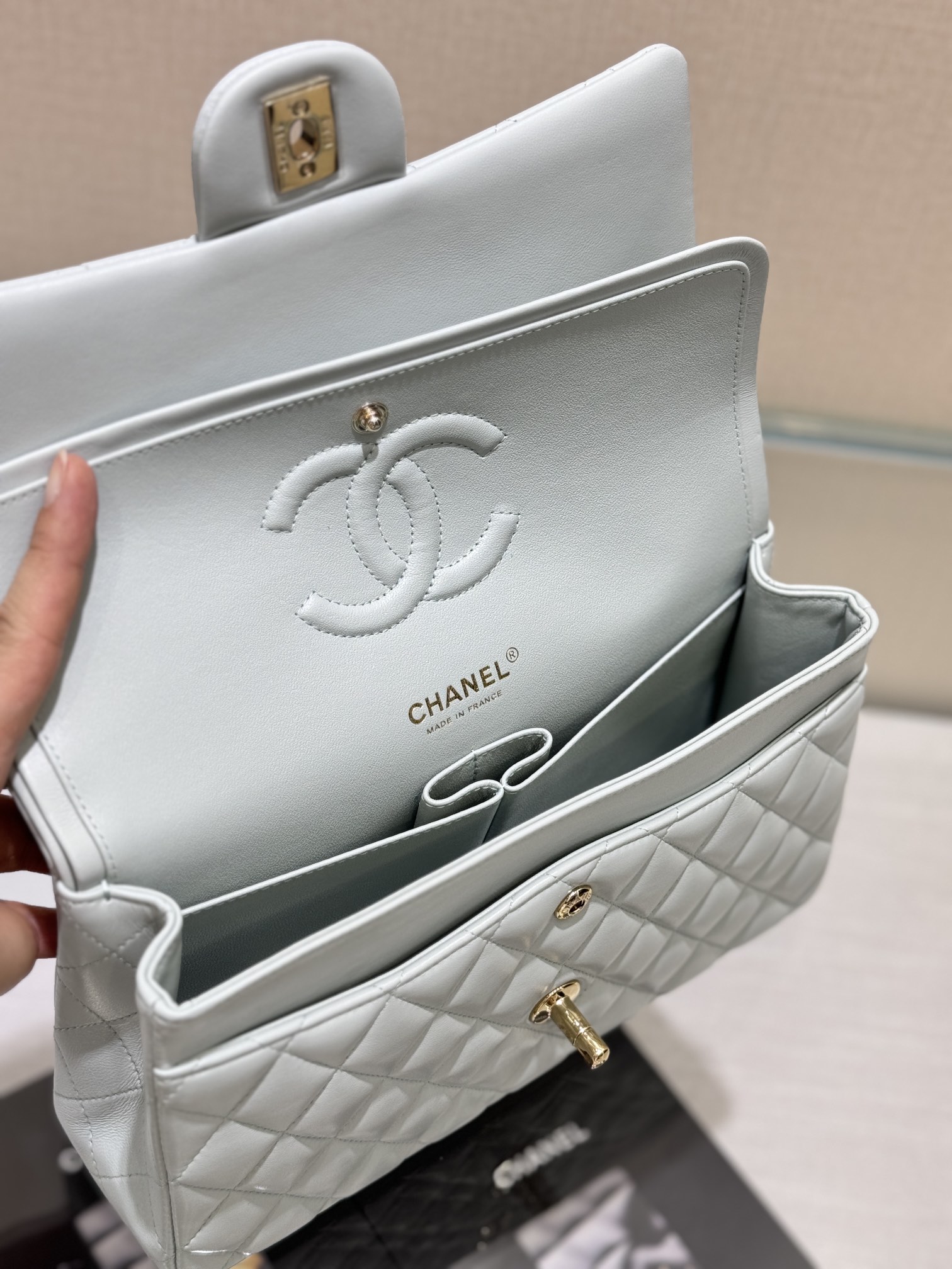 This is a replica CHANEL Classic 11.12 Flap Bag Lambskin & Gold-Tone Metal in Light blue. This classic double flap bag comes in smooth light blue lambskin featuring gold-tone hardware. Open pocket on the back. Closes with classic CC-turn-lock on the front. Zipper pocket inside the flap. Outside pocket on the front under the flap. A lipstick pocket against the back. CC stitching on the inside flap. ,Size,