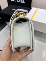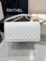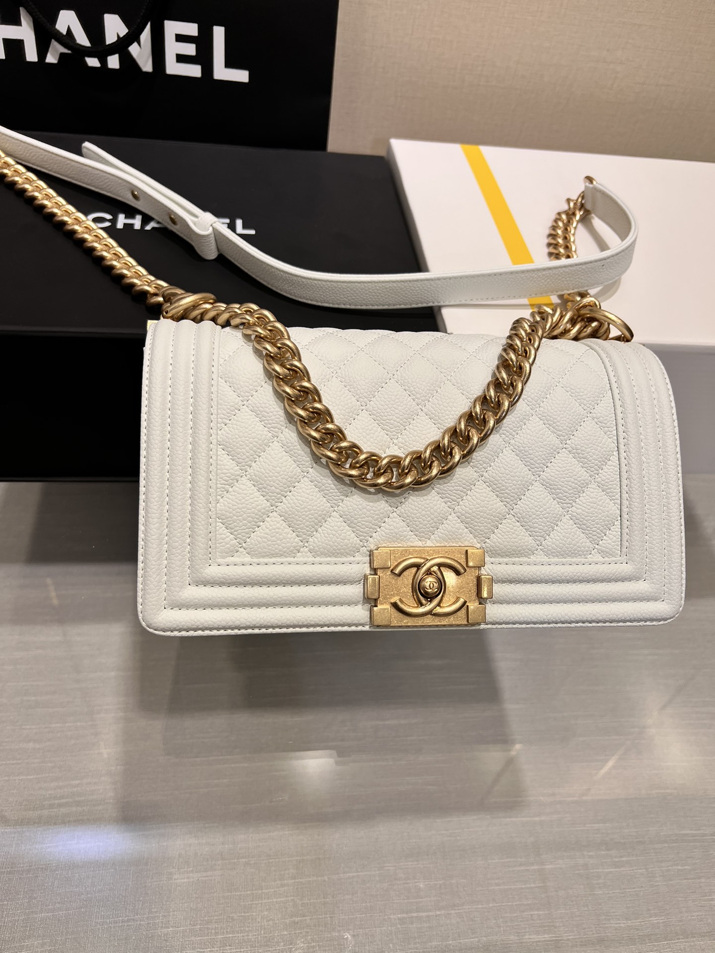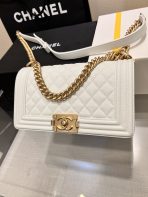 This is a replica CHANEL Classic Boy Flap Calfskin & oG Metal in White. This small boy flap bag comes in caviar black caviar calfskin featuring gold-tone hardware. Grosgrain Lining & Single Interior Pocket. ,Size: Classic,