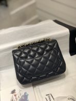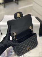 This is a replica CHANEL Mini Square Classic Handbag Lambskin & Gold-Tone Metal in Black. This mini square flap bag comes in smooth black lambskin featuring gold-tone hardware. Open pocket on the back. Closes with classic CC-turn-lock on the front. Zipper pocket inside the flap. Outside pocket on the front under the flap. Lined in burgundy leather with two open and a lipstick pocket against the back. CC stitching on the inside flap.  Size
