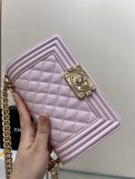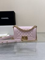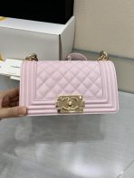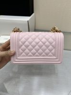 This is a replica CHANEL Small Boy Flap Calfskin & Ruthenium-Finish Metal in Pink. This small boy flap bag comes in caviar black caviar calfskin featuring gold-tone hardware. Grosgrain Lining & Single Interior Pocket. ,Size: Small,