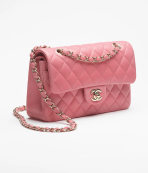 This is a replica CHANEL Small Classic Handbag Lambskin & Gold-Tone Metal in Pink. This small double flap bag comes in smooth pink lambskin featuring gold-tone hardware. Open pocket on the back. Closes with classic CC-turn-lock on the front. Zipper pocket inside the flap. Outside pocket on the front under the flap. CC stitching on the inside flap. ,