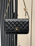 This is a replica CHANEL Wallet on Chain Shiny Lambskin, Enamel & Gold-Tone Metal in Black . The bag features an aged gold chain link leather threaded shoulder strap with a white enameled CC length adjuster, and a facing aged gold and black enamel CC turn lock.