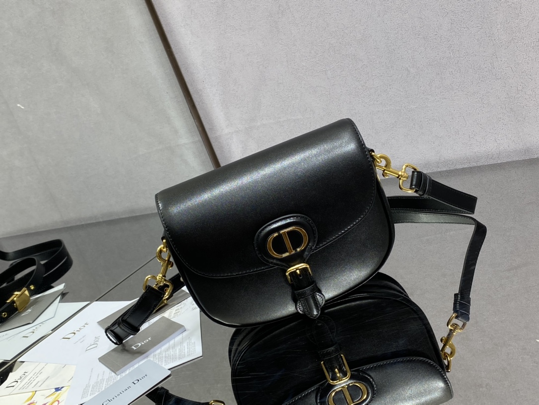This is a replica CHRISTIAN DIOR Saddle Bag with Strap in black. This bag is finely crafted of shiny box black leather. The bag features a rear pocket, a magnetic clasp and polished gold hardware. The flap opens to a black fabric interior with a patch pocket.,