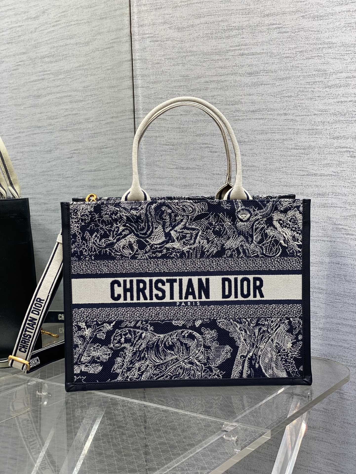 This is a replica CHRISTIAN DIOR Medium Dior Book Tote in Blue and Ecru Toile de Jouy Reverse Embroidery with Blue Calfskin. Main composition of t, cotton and calfskin. ,