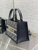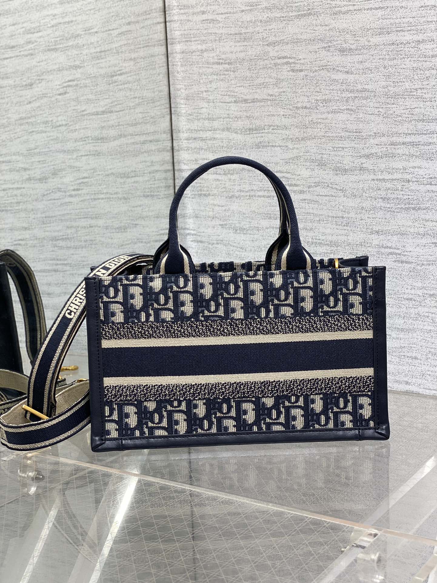 This is a replica CHRISTIAN DIOR Mini Dior Book Tote in blue. This tote combines Dior Oblique Embroidery and Calfskin. Embroidered adjustable and removable shoulder strap. ,