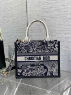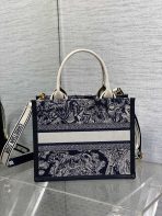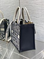 This is a replica CHRISTIAN DIOR Small Dior Book Tote in blue and ecru toile de jouy. This tote combines Dior Oblique Embroidery and Calfskin. Embroidered adjustable and removable shoulder strap. ,