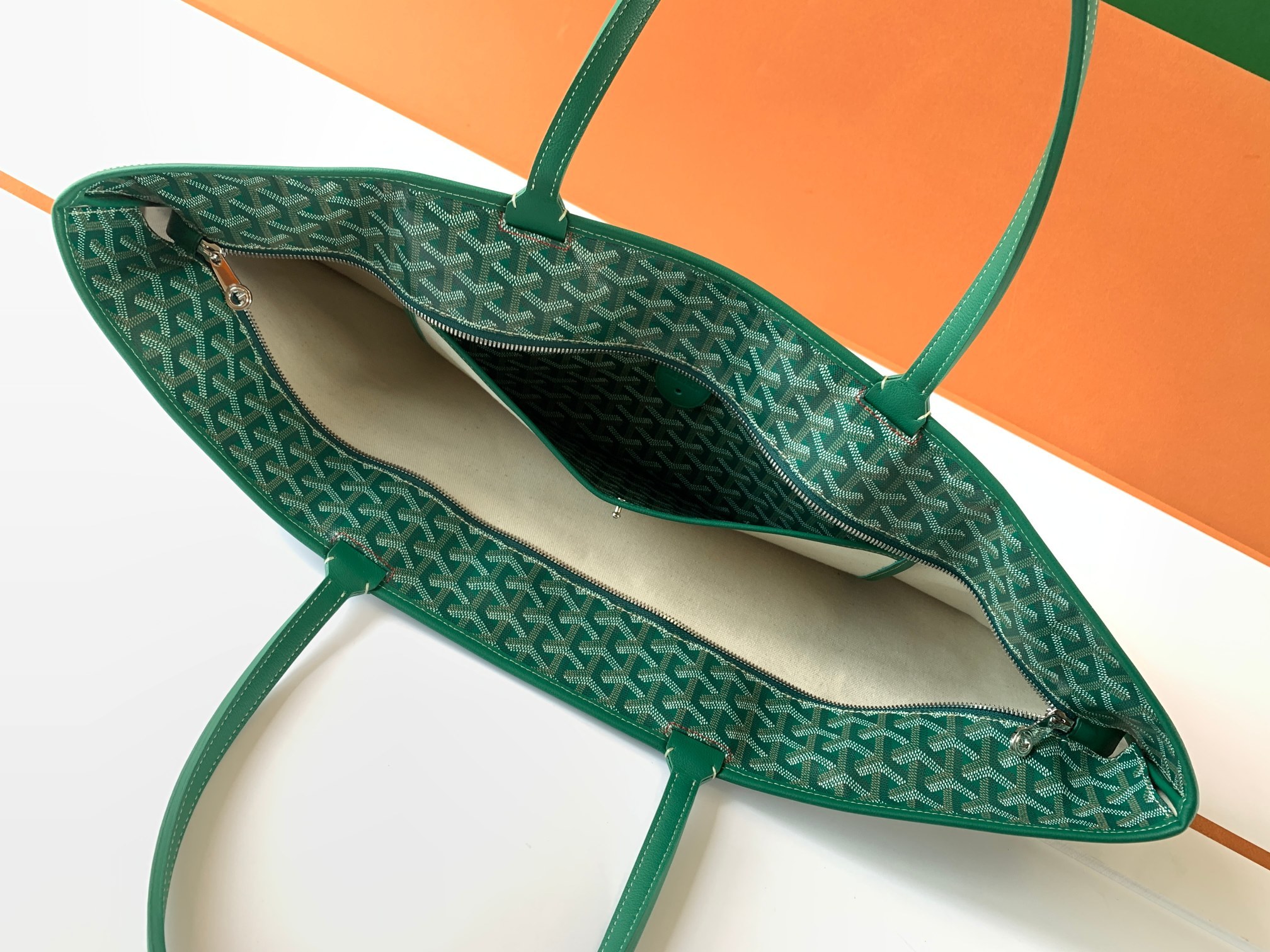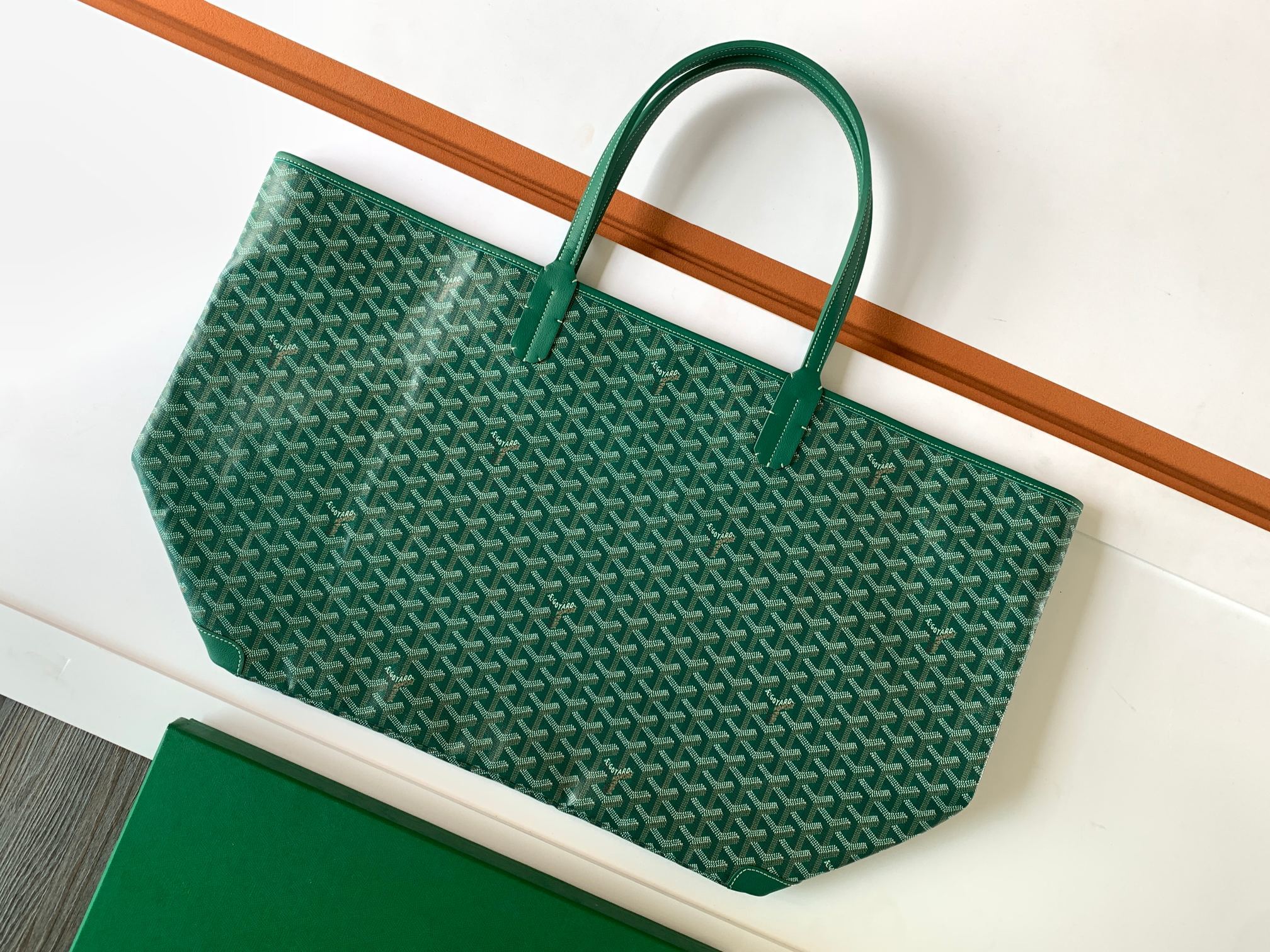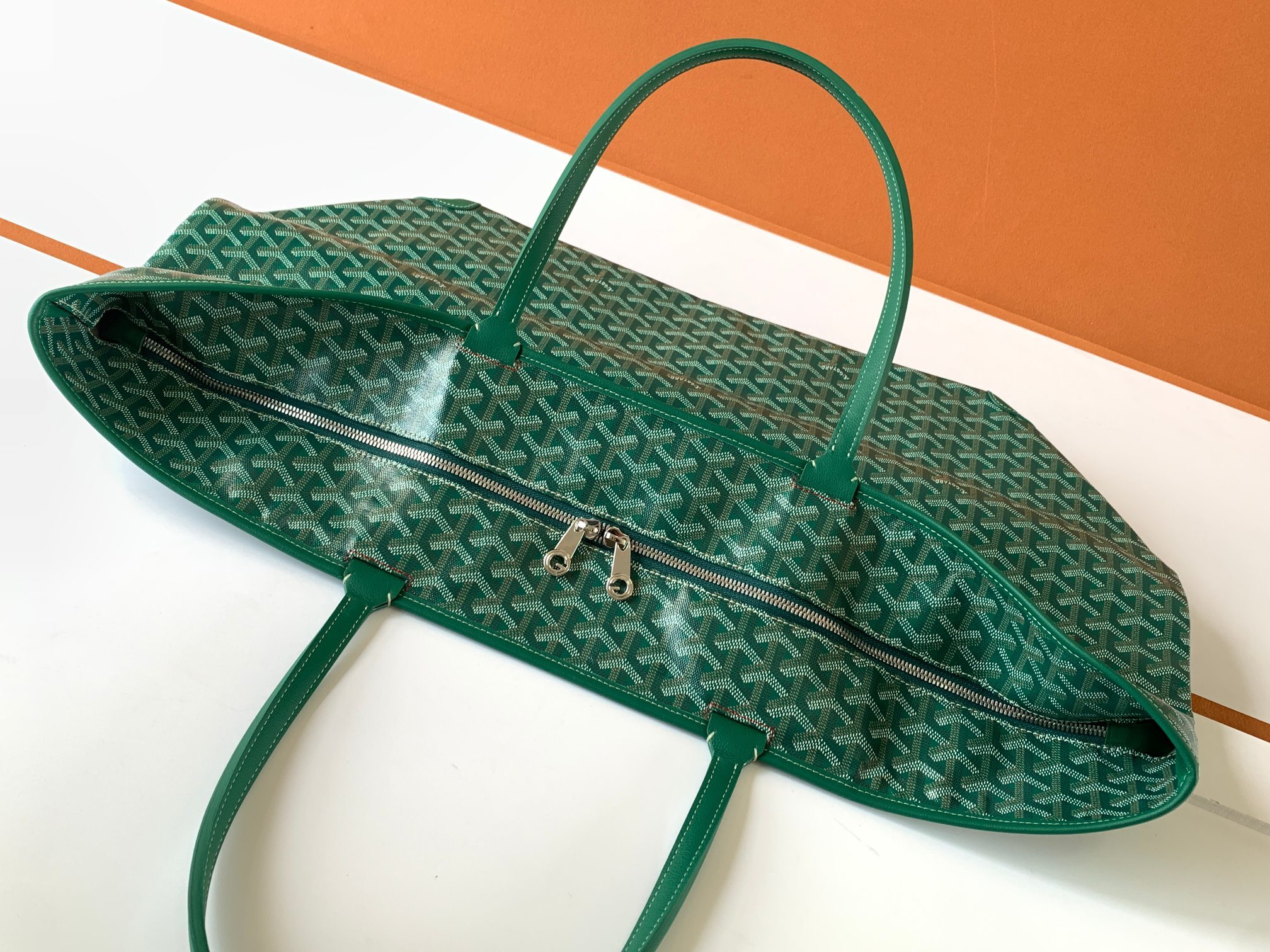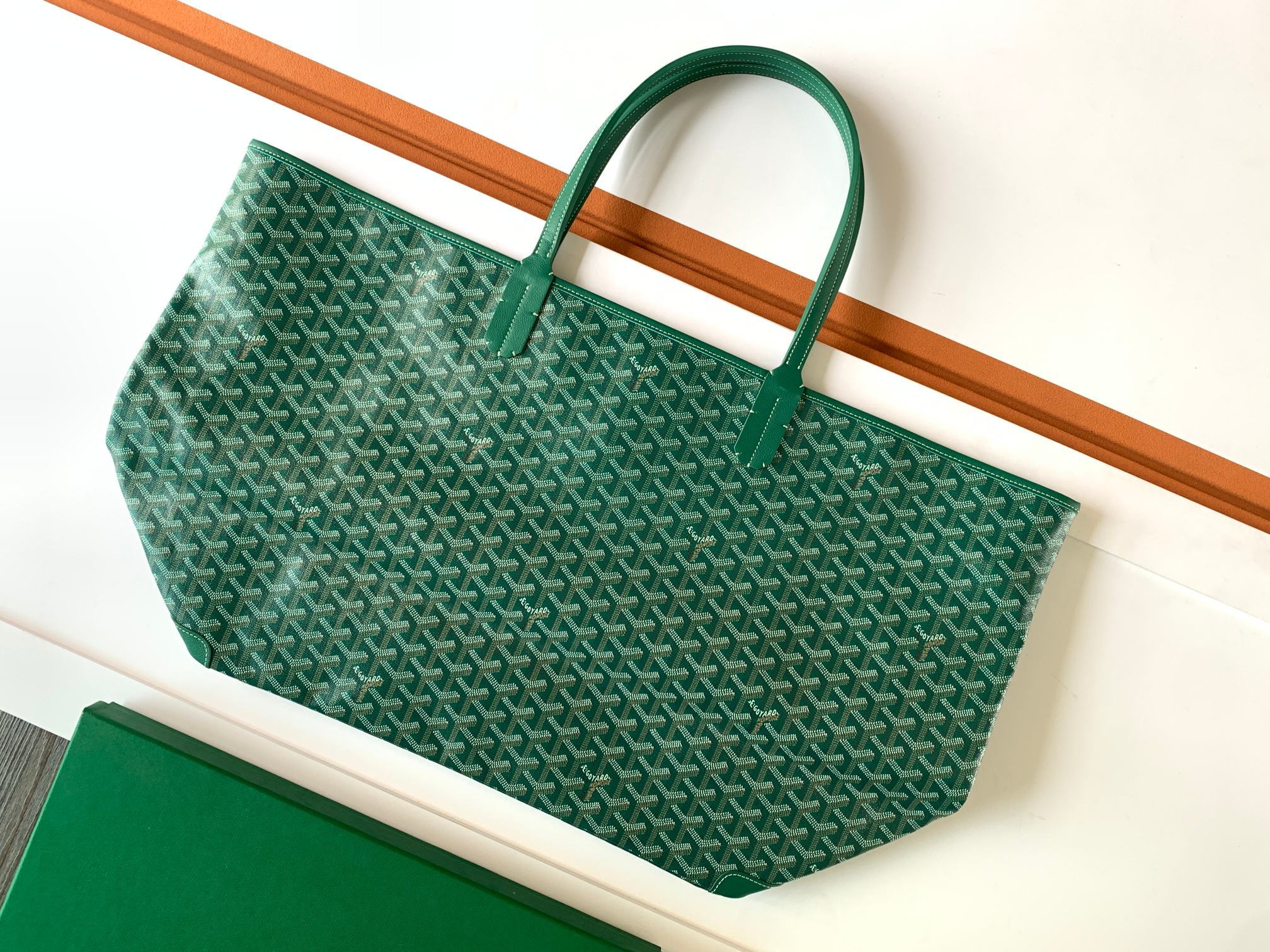 This is a replica GOYARD Artois GM Bag in green. The Artois GM bag uses the aesthetic lines and codes of our Artois PM and MM bags in a travel format, ideal for a weekend or as carry-on luggage. The handles ensure comfort when worn over the shoulder. The zip closure has two lockable zips to secure the contents.,