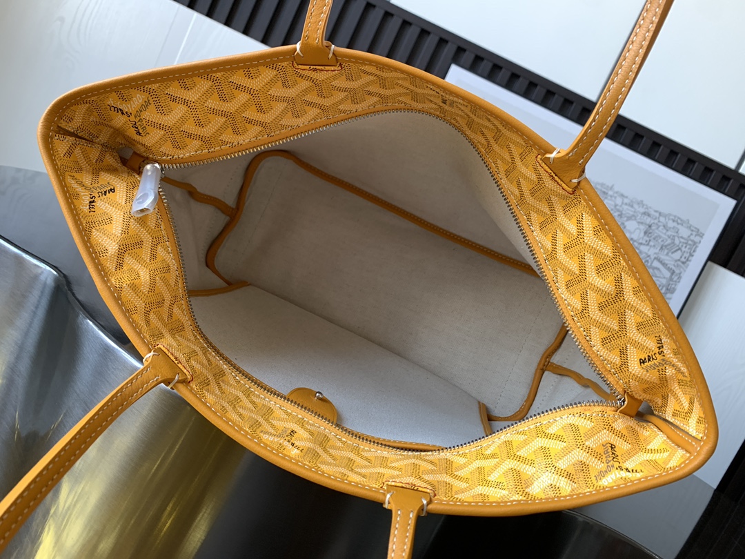 This is a replica GOYARD Artois MM Bag in yellow. The Artois GM bag uses the aesthetic lines and codes of our Artois PM and MM bags in a travel format, ideal for a weekend or as carry-on luggage. The handles ensure comfort when worn over the shoulder. The zip closure has two lockable zips to secure the contents.,