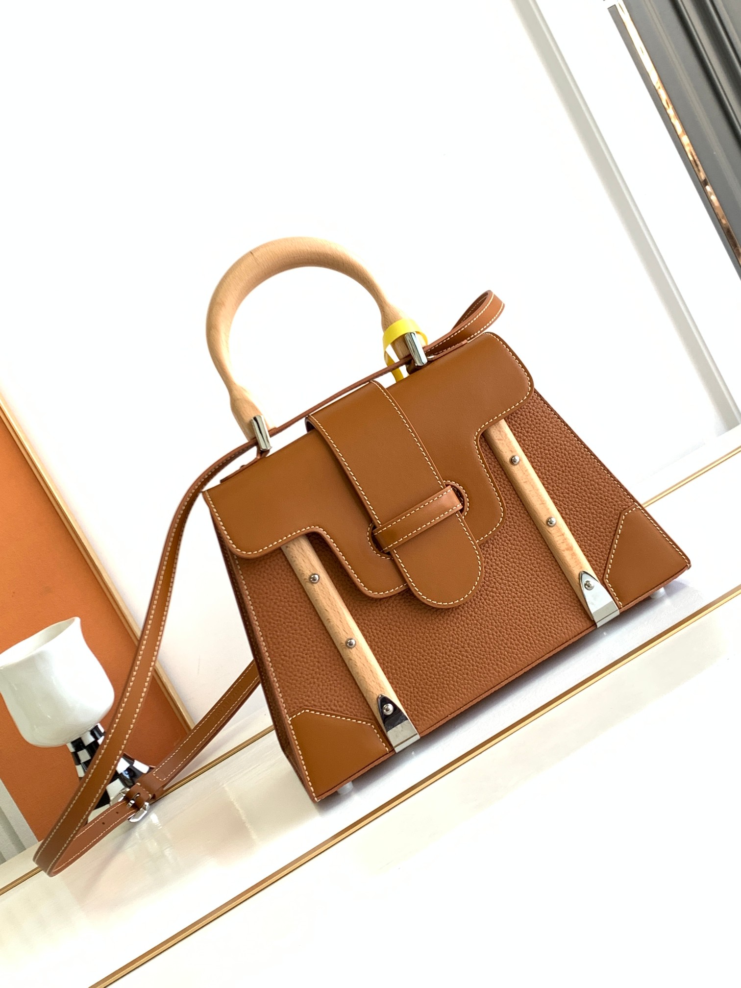 This is a replica GOYARD Saïgon PM Bag in tan calfskin leather. The Saïgon bag is one of Maison Goyard’s emblematic pieces as it inherits all our trunk-making signature codes like the wood batons, leather corners and trunk rivets. In this structured PM size, the Saïgon bag can be worn with or without a strap for a chic and elegant style.,