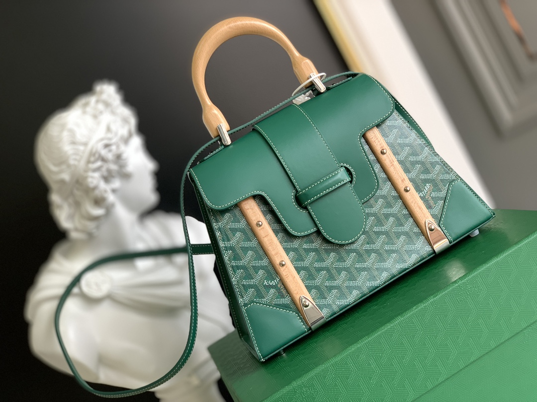 This is a replica GOYARD Saïgon PM Bag in green. The Saïgon bag is one of Maison Goyard’s emblematic pieces as it inherits all our trunk-making signature codes like the wood batons, leather corners and trunk rivets. In this structured PM format, the Saïgon bag can be worn with or without a strap for an elegant evening style.,