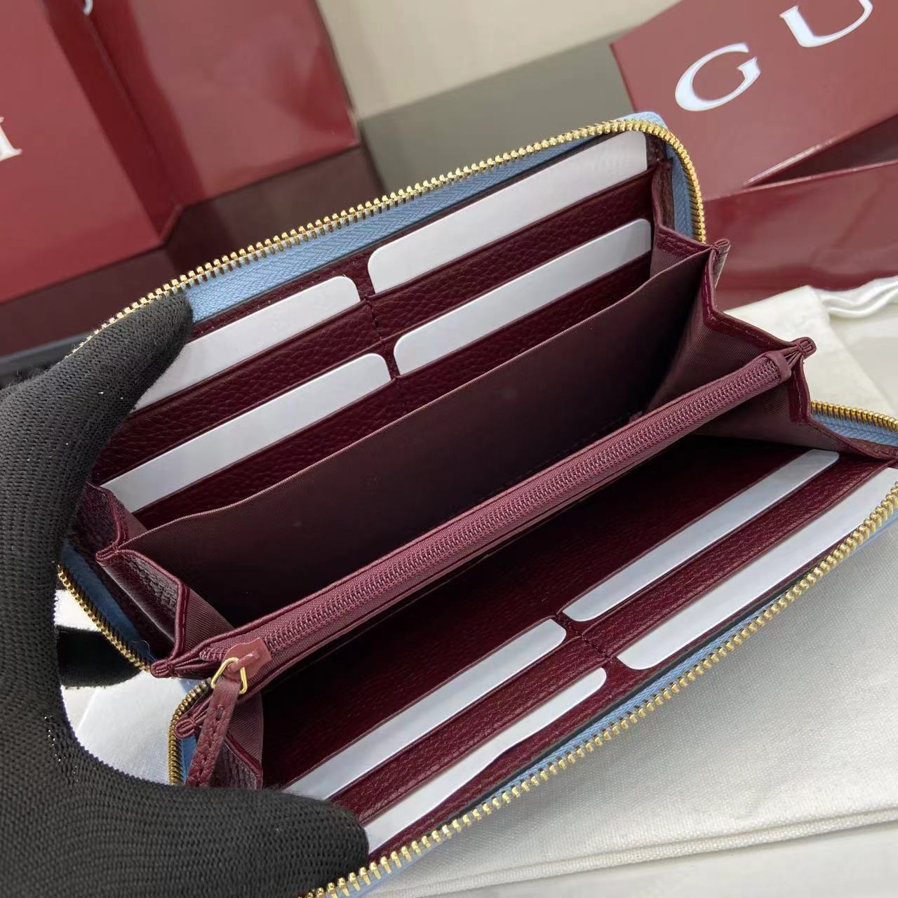 ,Light blue and beige leather,Gold-toned hardware,Taupe taffeta lining,Double G,12 card slots and three bill compartments,Zip coin pocket,Zip around closure,Weight: 0.50lbs approximately,7.5″W x 4.1″H x .8″D