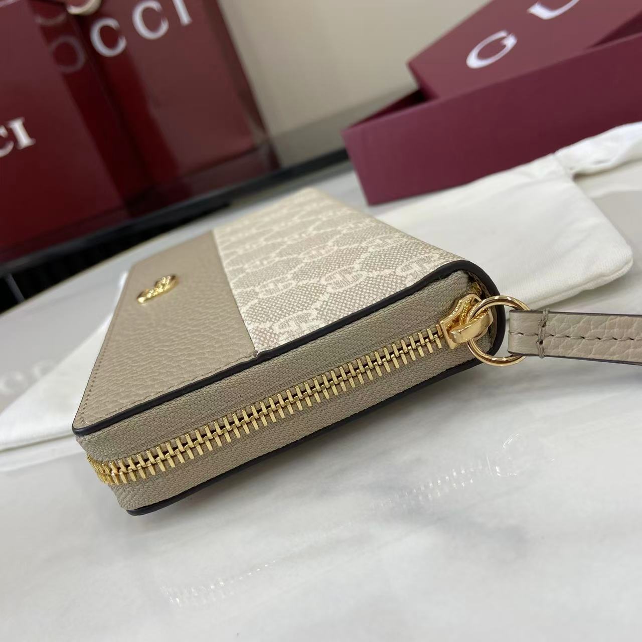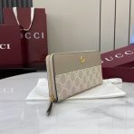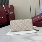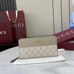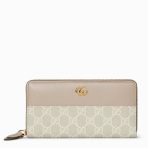 ,Beige and white GG Supreme and beige leather,Gold-toned hardware,Brown taffeta lining,Double G,12 card slots and three bill compartments,Zip coin pocket,Zip around closure,Weight: 0.50lbs approximately,7.5″W x 4.1″H x .8″D