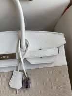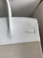 ###This Birkin is in White togo leather and Craie canvas with Palladium hardware and has tonal stitching, front flap, two straps with center toggle closure, clochette with lock and two keys, and double rolled handles.###