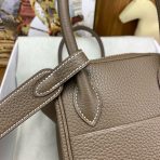 ###This Lindy is of Etoupe clemence with gold hardware and features contrast stitching, double zipper pulls, center Hermès twist lock closure, five palladium feet, and two top handles that are linked by a removable shoulder strap.###