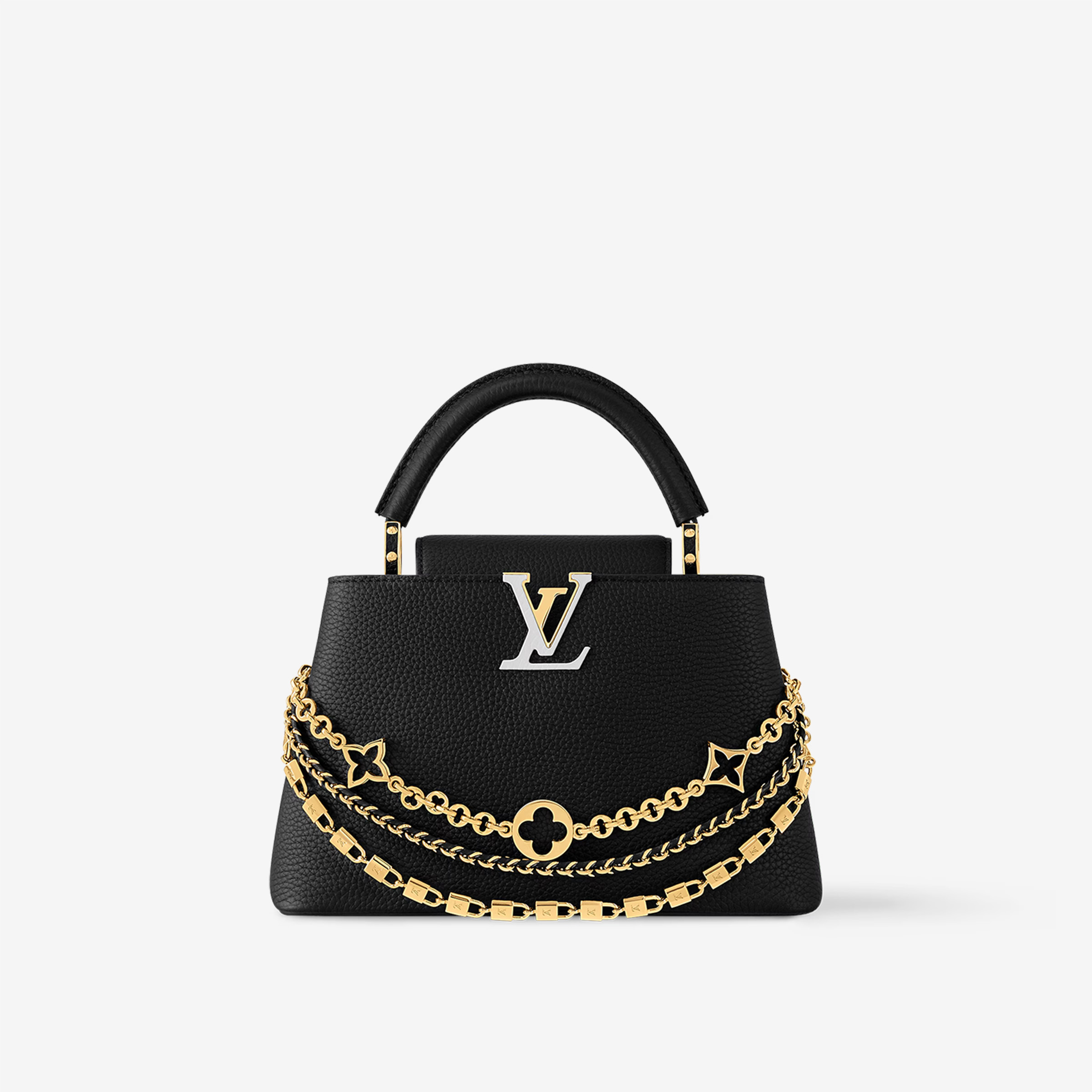 This is a replica LOUIS VUITTON M12345 Capucines BB. ,10.6 x 6.8 x 3.5 inches ,Black,Taurillon leather,Taurillon-leather trim,Cowhide-leather lining,Gold-toned hardware with enameled details,Double carry style: flap inside or outside,Compartmented interior with 1 zipped pocket and 2 flat pockets,4 protective metal base feet,Removable set of 3 chains,Strap:Removable, adjustable,Strap drop:18.3 inches,Strap drop max:21.7 inches,Handle:Single