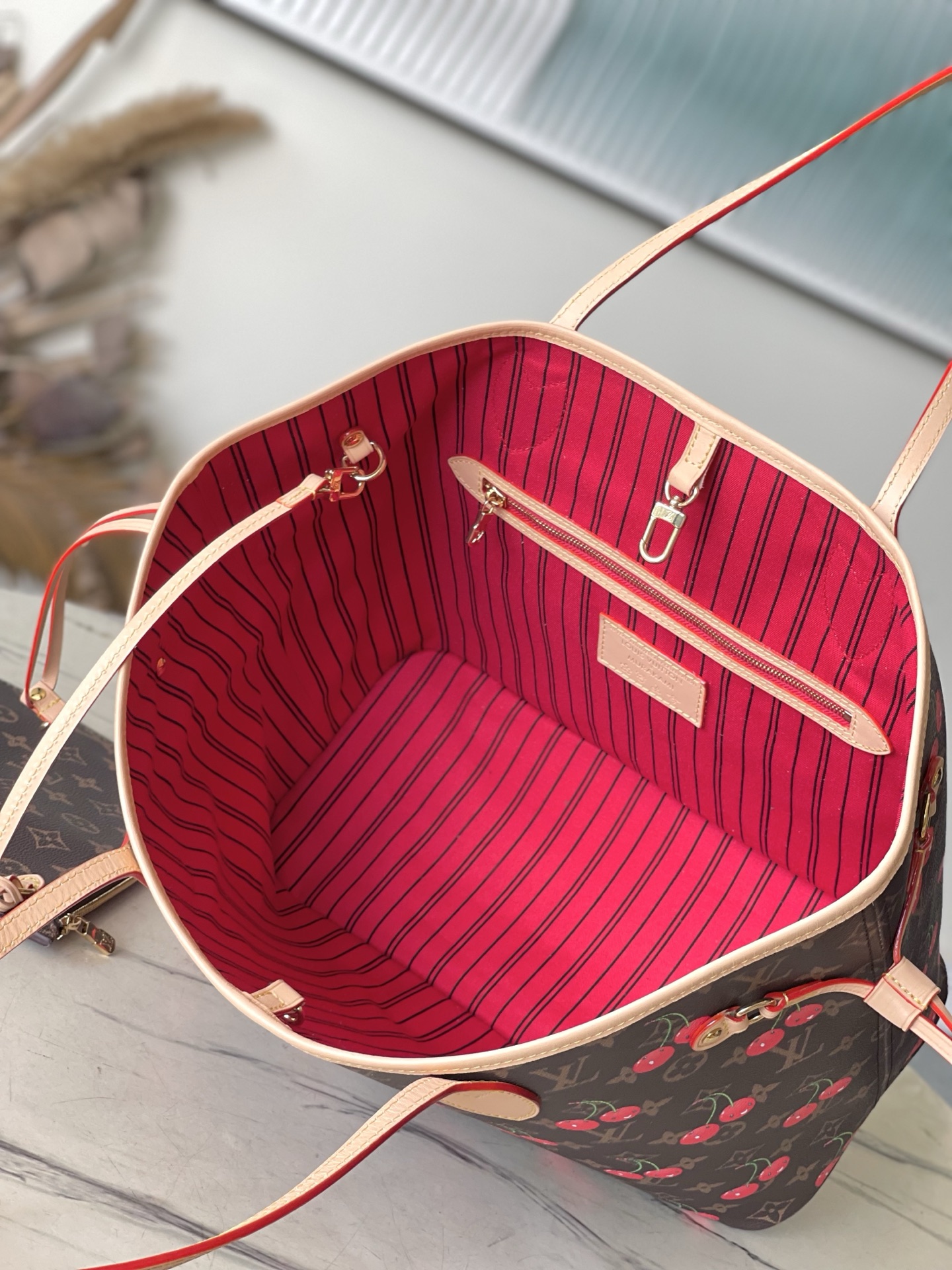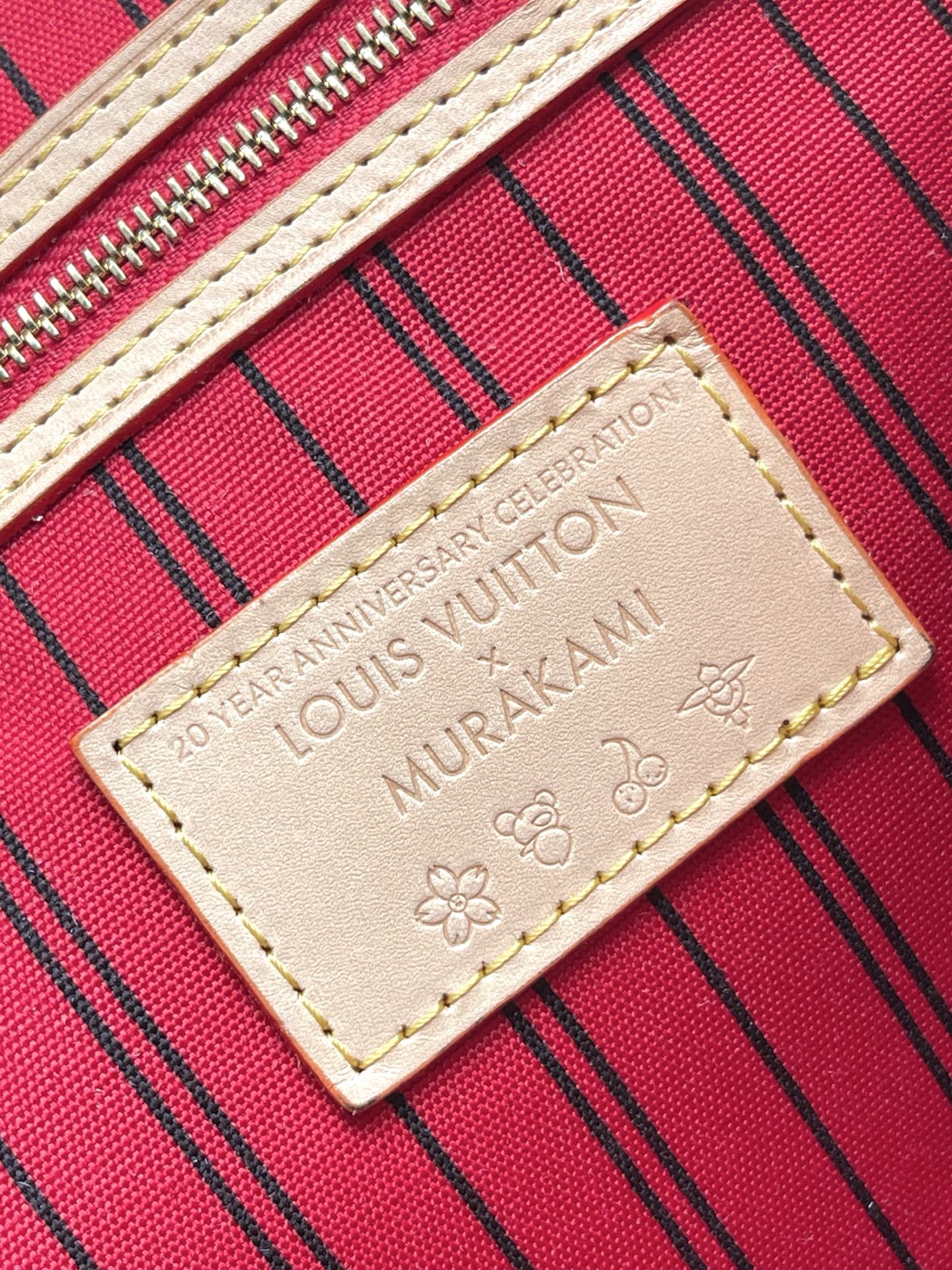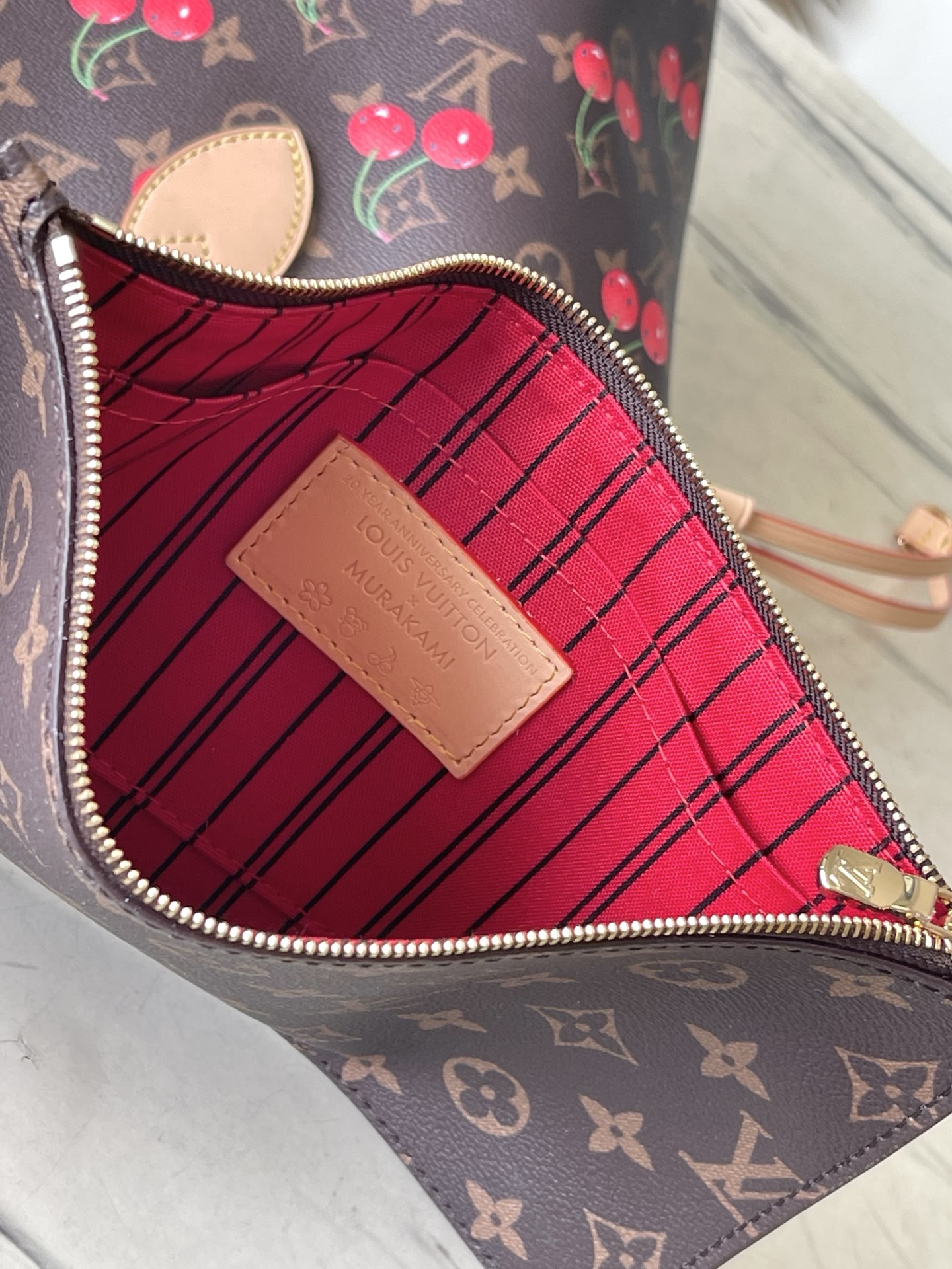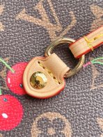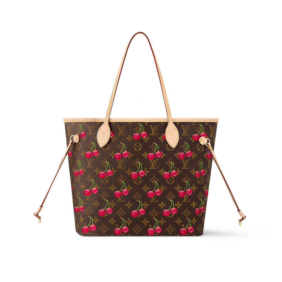 This is a replica LOUIS VUITTON M13263 LV x TM Neverfull MM Bag. ,31 x 28 x 14 cm ,Monogram cherry coated canvas,Cowhide leather trim,Textile lining,Gold-colour hardware,Hook closure,Removable zipped pouch,4 side laces,Fits 13-inch laptop, smartphone, earphones, Zippy Long Wallet, keys,Handle: Single x2