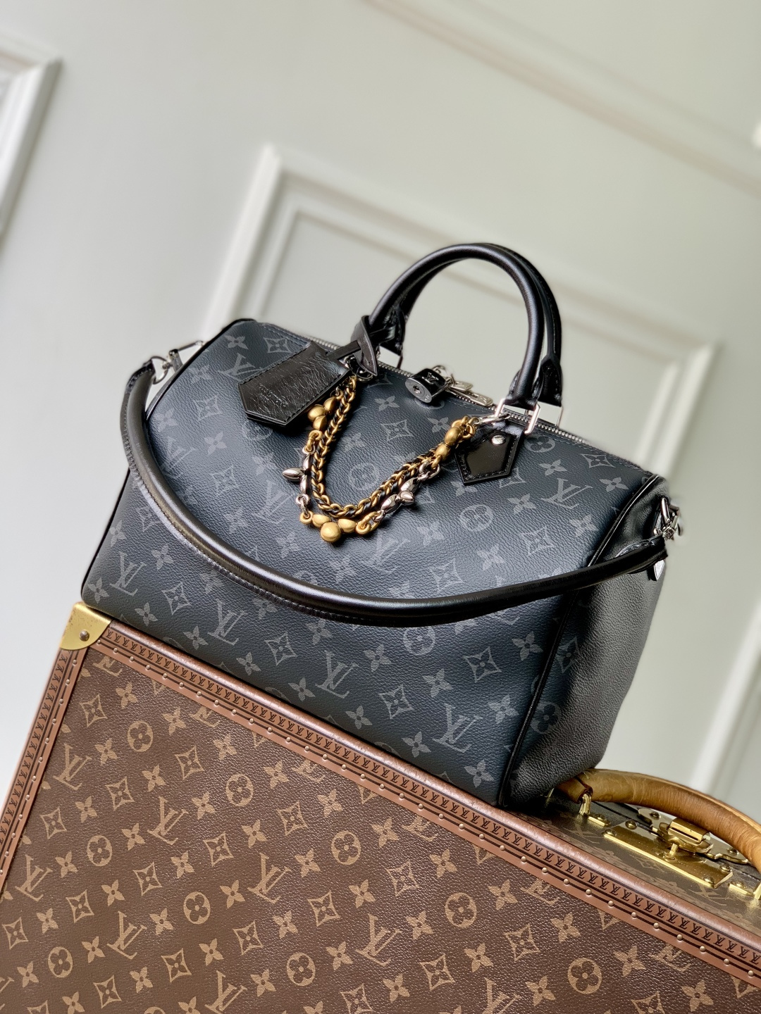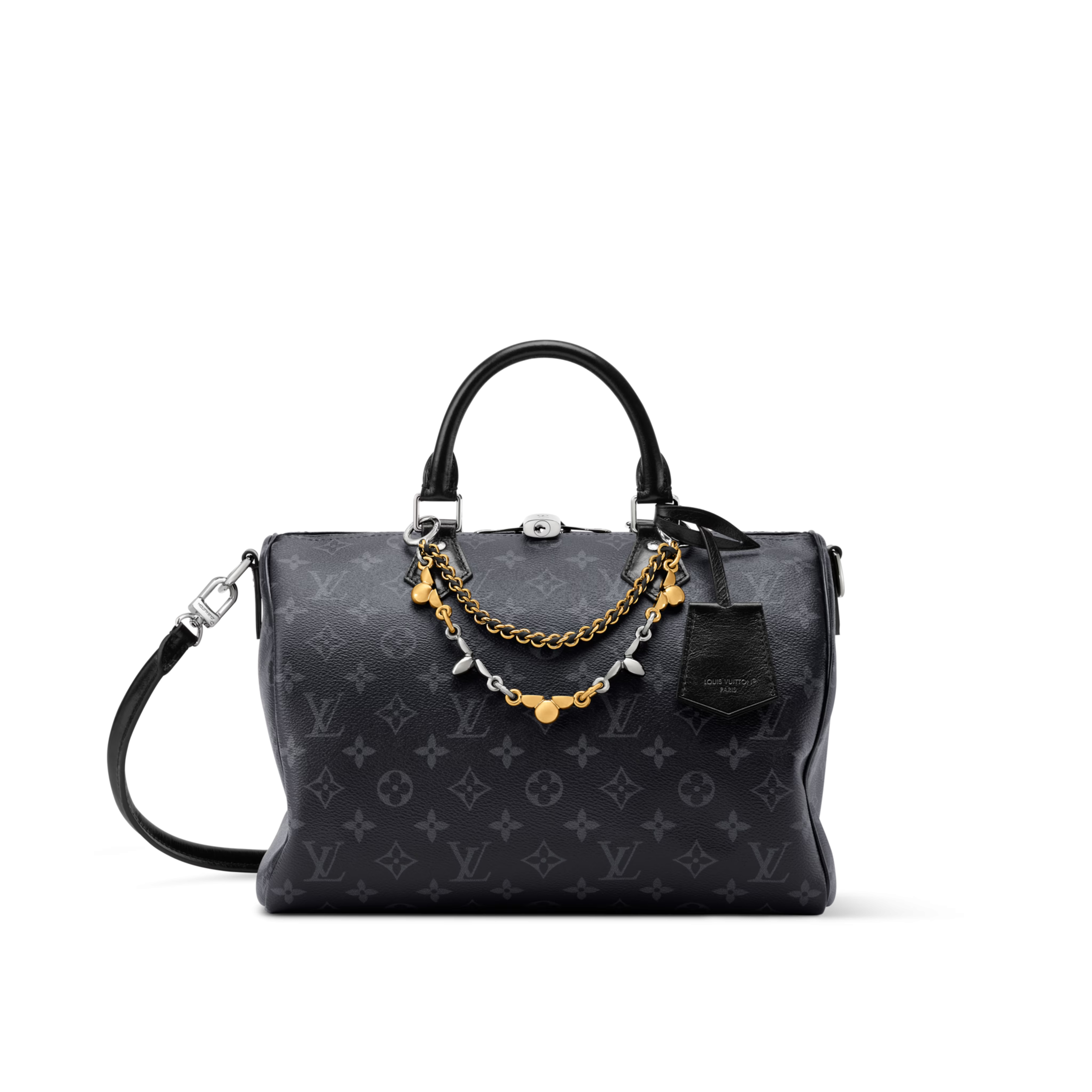This is a replica LOUIS VUITTON M15102 Speedy Soft 30. ,11.8 x 8.3 x 6.7 inches,(Length x Height x Width),Monogram Eclipse/Black,Coated canvas,Cowhide-leather trim,Grained cowhide-leather lining,Silver-toned and gold-toned hardware,Double zipper closure,1 zipped interior pocket,1 removable double chain,1 keybell,Fits: 9-inch tablet, 6.7-inch smartphone, earphones, Zippy wallet, keys, sunglasses, lipstick,Strap:Removable, not adjustable,Strap drop:9.4 inches,Handle:Double