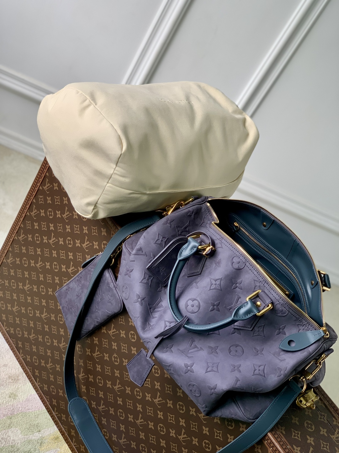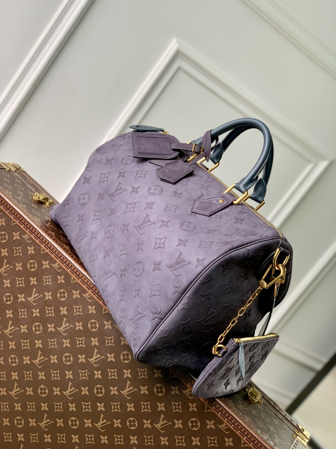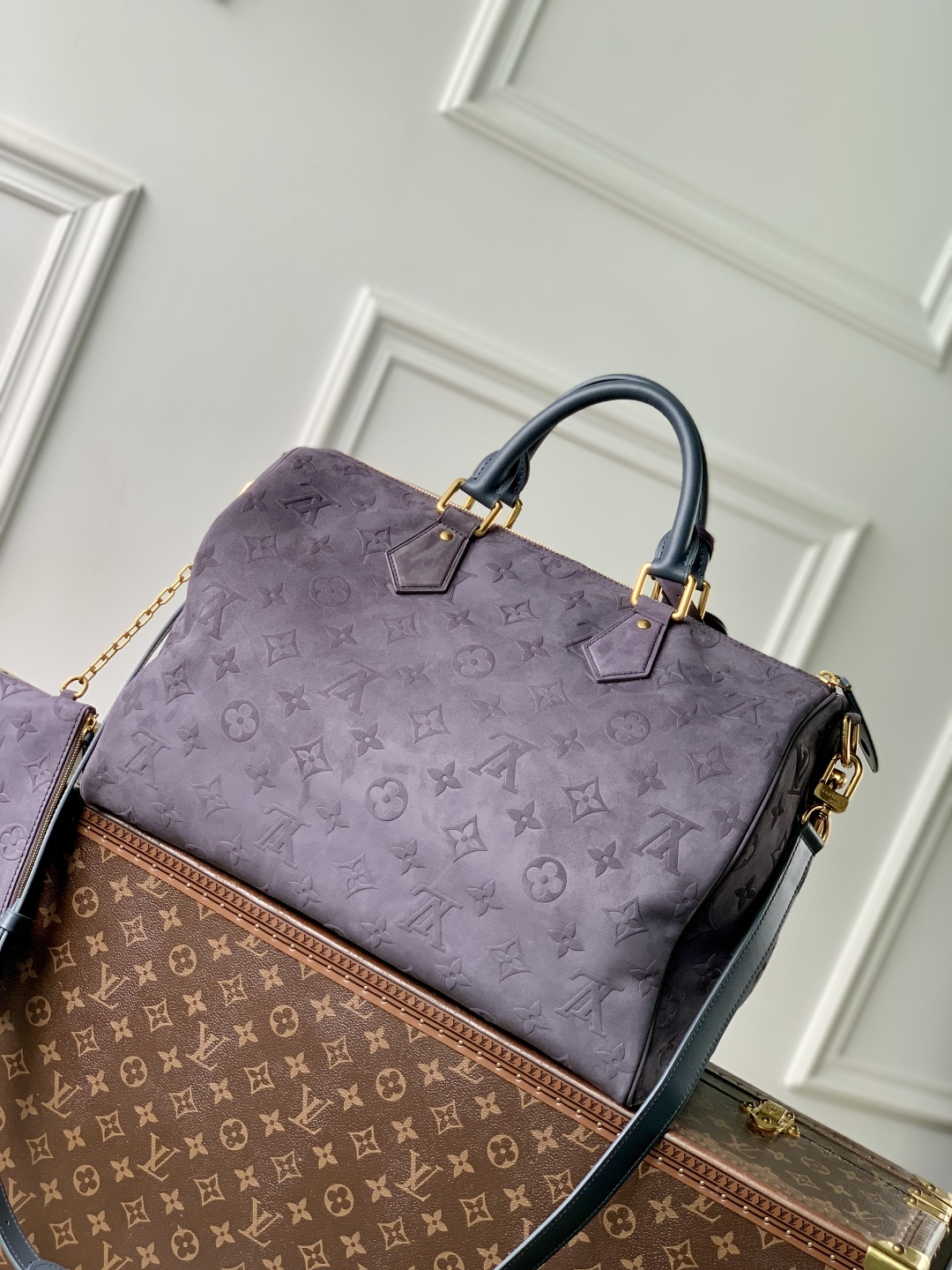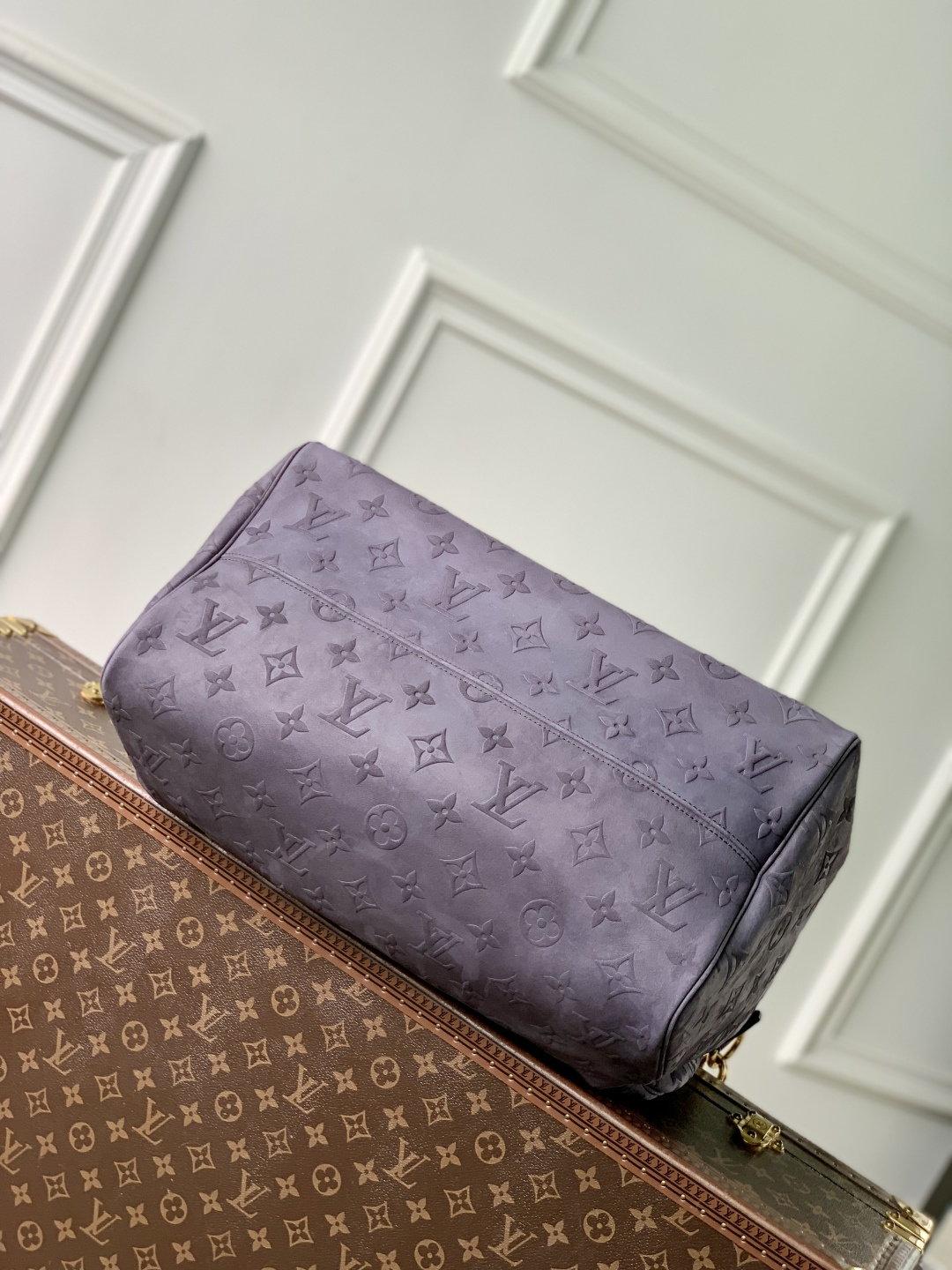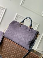 This is a replica LOUIS VUITTON M15225 Speedy P9 Bandoulière 40. ,40 x 26 x 23 cm ,Grey,Suede,Cowhide leather trim,Lambskin leather lining,Coloured hardware,Main compartment with lock,Flat inside trio pocket,Zipped inside pocket,Removable pouch in leather,Name tag,Key bell,Strap: Removable, adjustable,Strap Drop: 46.0 cm,Strap Drop Max: 60.0 cm,Handle: Single x2