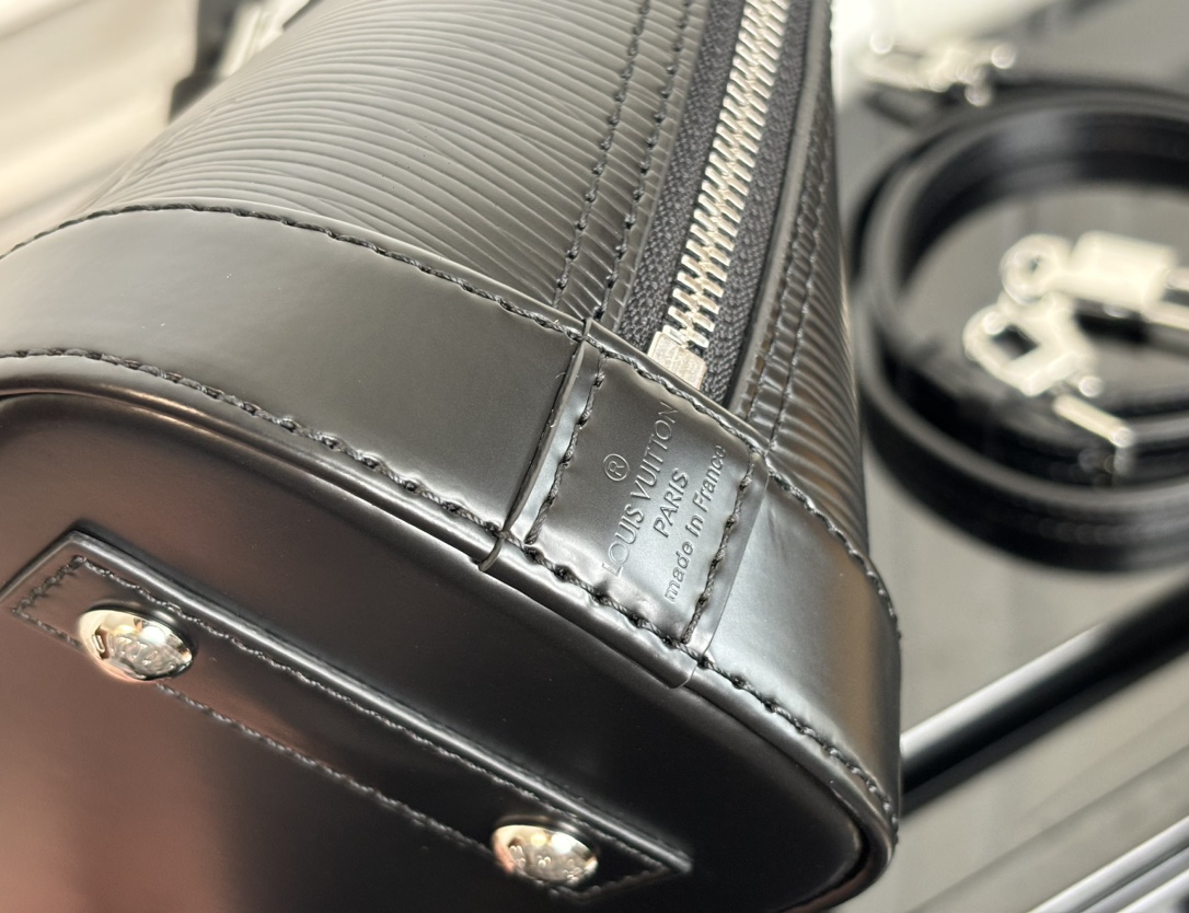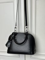 This is a replica LOUIS VUITTON M24645 Alma BB.,9.3 x 6.9 x 4.5 inches ,Black,Epi grained cowhide leather,Smooth cowhide-leather trim,Microfiber lining,Silver-color hardware,Double zip closure,Padlock,Key bell,Inside flat pocket,4 protective metal bottom studs,Fits: 6.7-inches smartphone, earphones, lipstick, tissues, keys, sunglasses,Weight: 0.5 kg,Strap:Removable, adjustable,Strap drop:19.7 inches,Strap drop max:24.4 inches,Handle:Double