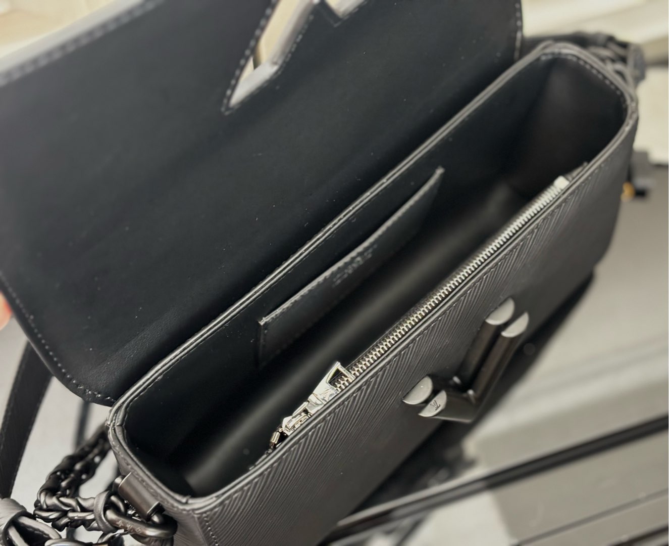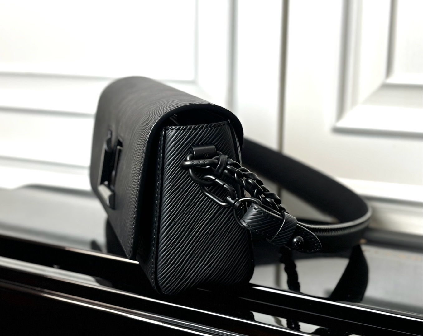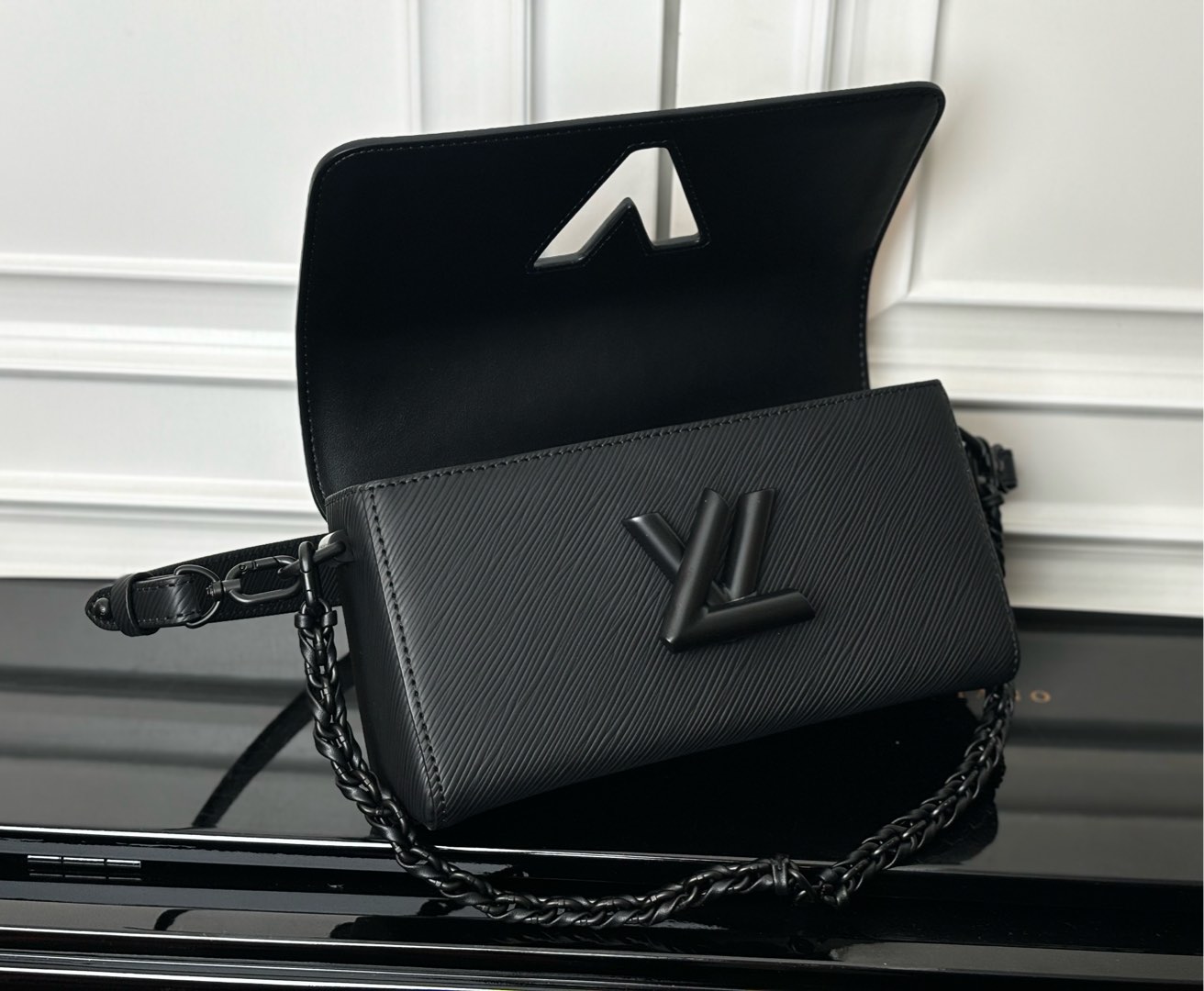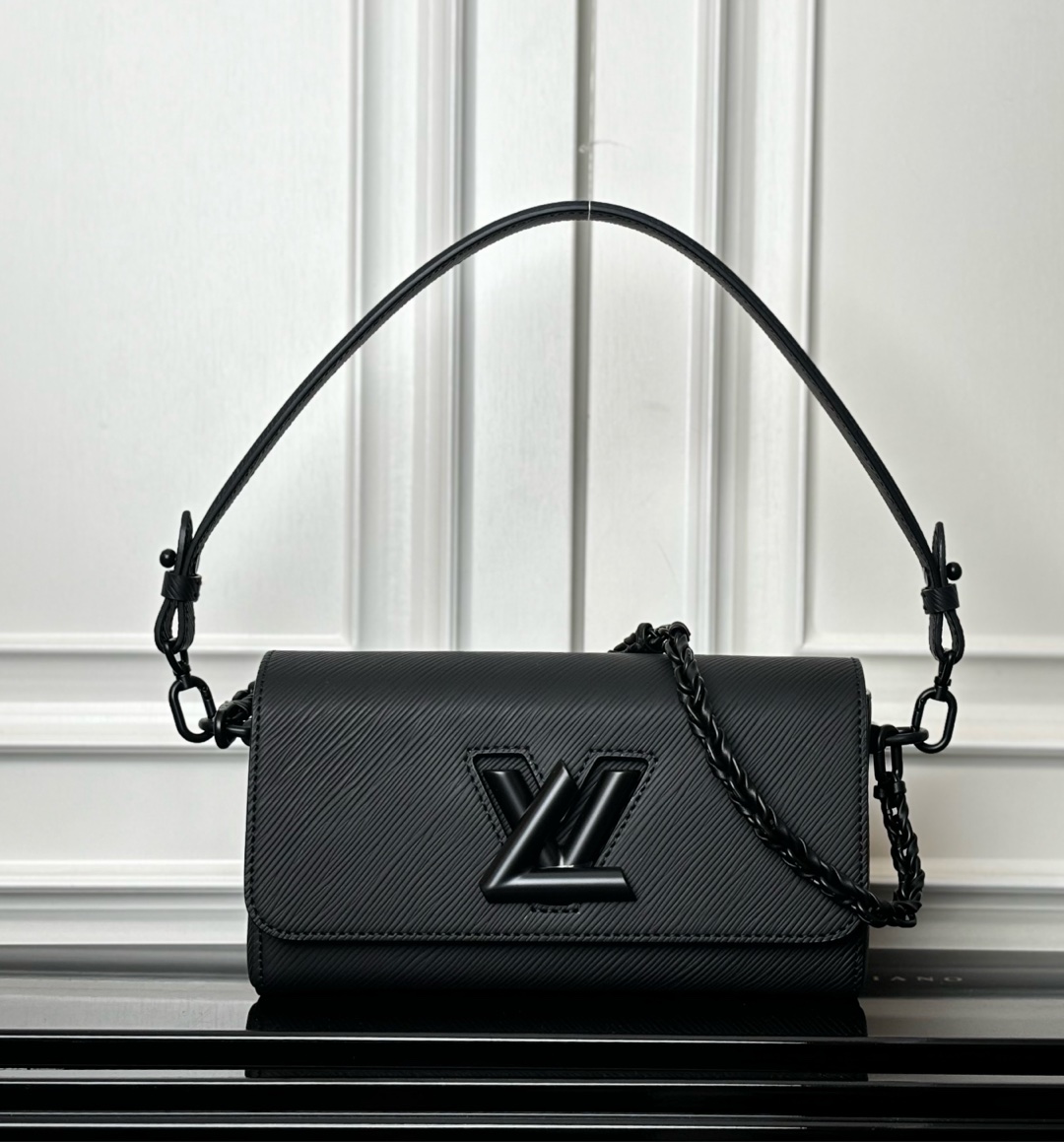 This is a replica LOUIS VUITTON M25336 Twist West.,9.3 x 4.7 x 2.8 inches ,All Black,Matte Epi grained leather,Matte Epi grained-leather trim,Smooth cowhide-leather lining,Matte black hardware,LV Twist lock,Interior flat back pocket with removable mirror,Large interior front pocket with zipped section,Strap:Removable, not adjustable,Strap drop:7.7 inches,Chain:Removable,Chain drop:7.7 inches