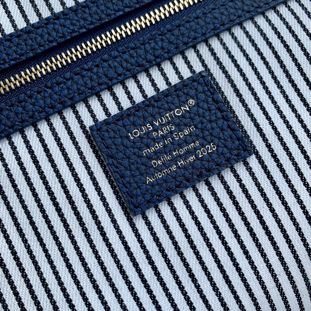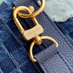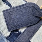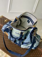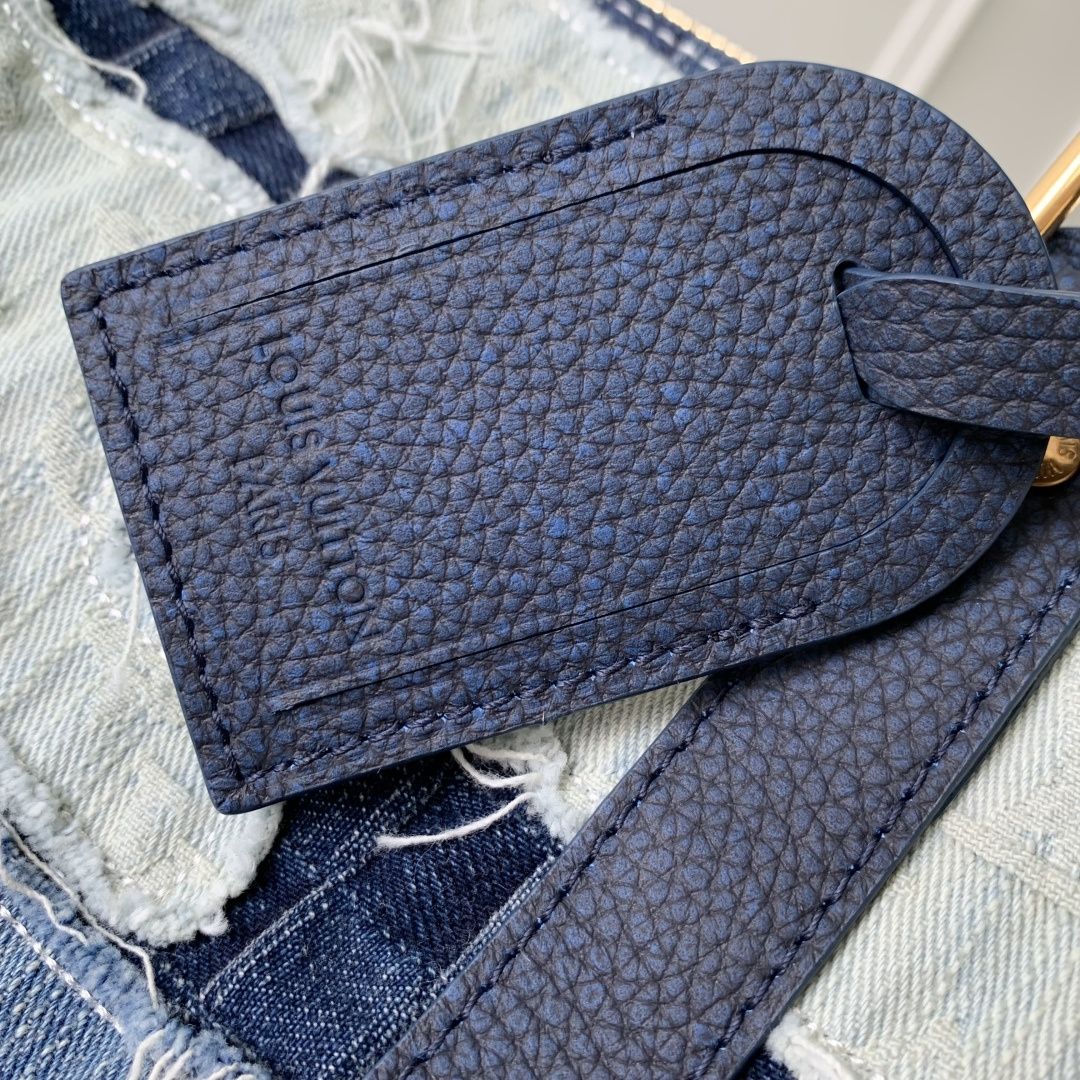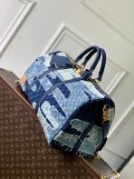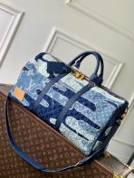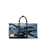 This is a replica LOUIS VUITTON M26117 Keepall Bandoulière 50. ,50 x 29 x 23 cm ,Denim Boro Landscape,Cowhide leather trim,Cotton lining,Gold-colour hardware,Cabin size,Double zip closure,Padlock,Removable name tag,Leather patch,Zipped inside pocket,Handle: Single x2