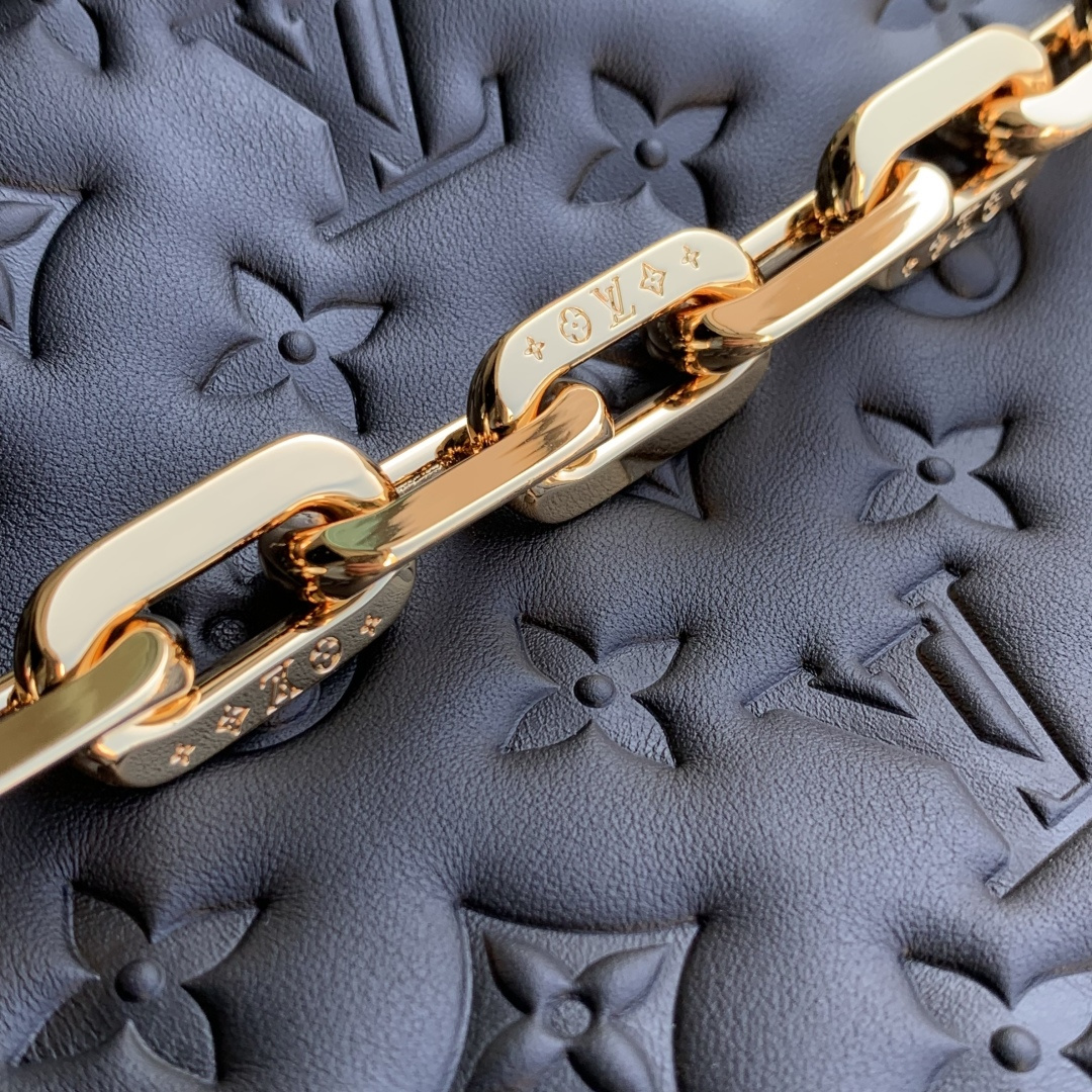 This is a replica LOUIS VUITTON M26216 Coussin Bucket. ,20 x 20 x 10 cm ,Black,Lamb leather,Cowhide leather trim,Microfibre lining,Gold-colour hardware,1 removable LV Chunky chain,Fits smartphone, earphones, Victorine wallet, keys, lipstick,Strap: Removable, adjustable,Strap Drop: 67.0 cm,Strap Drop Max: 116.0 cm,Chain: Removable,Chain Drop: 50.0 cm,Handle: Single