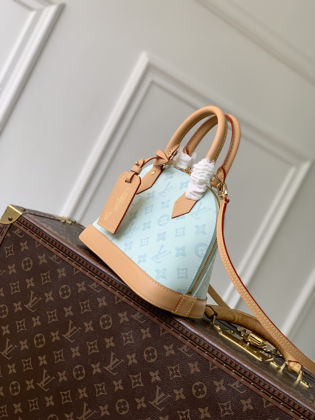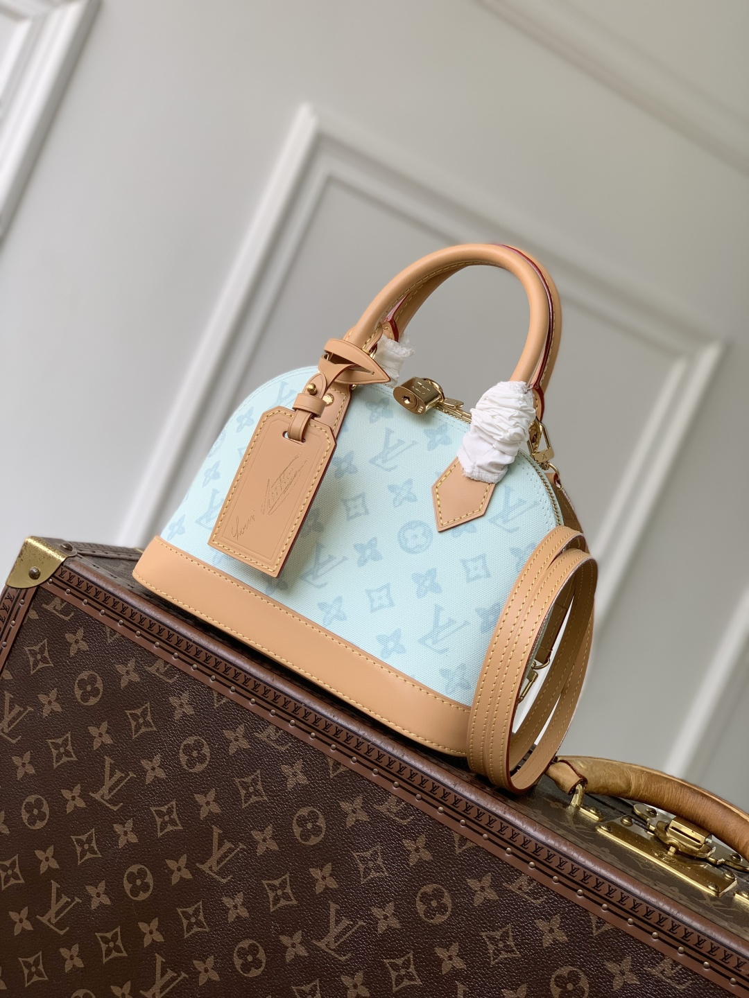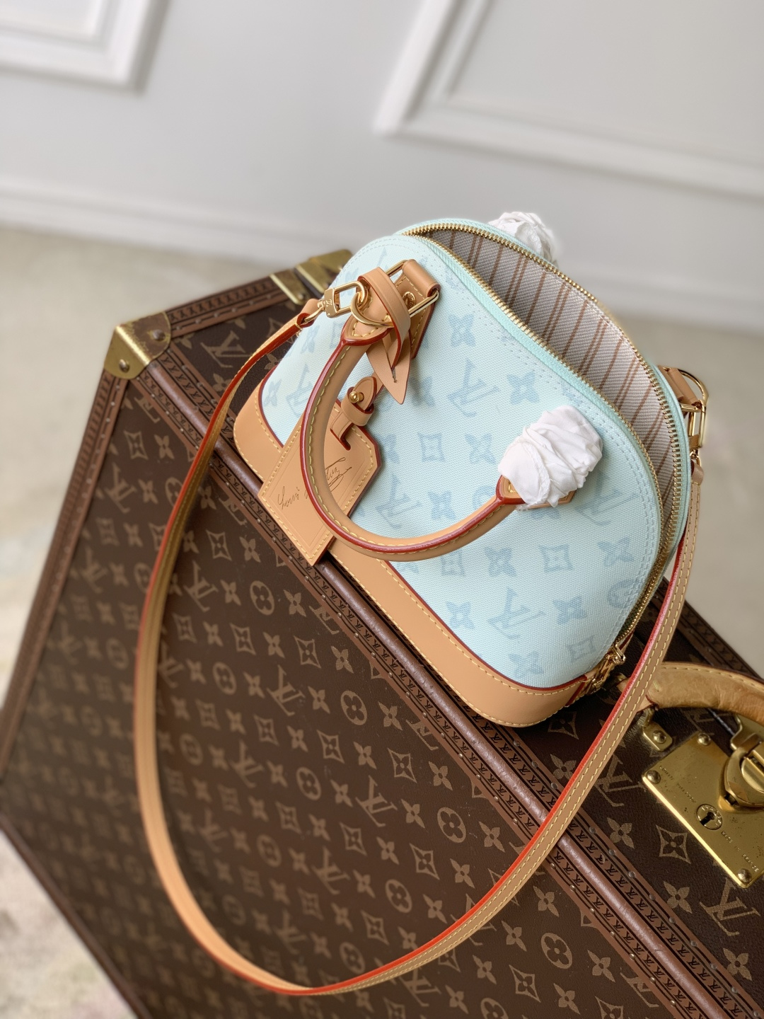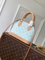 This is a replica LOUIS VUITTON M27526 Alma BB. ,23.5 x 17.5 x 11.5 cm ,Monogram Origine Courier Blue,Coated canvas,Cowhide leather trim,Striped textile lining,Gold-colour hardware,Double zip and padlock closure,1 removable special anniversary address tag,1 flat inside pocket,1 inside celebratory leather label,4 protective metal base feet,Fits 6.7-inch smartphone, earphones, Zippy Wallet, keys,Strap: Removable, adjustable,Strap Drop: 50.0 cm,Strap Drop Max: 62.0 cm,Handle: Single x2