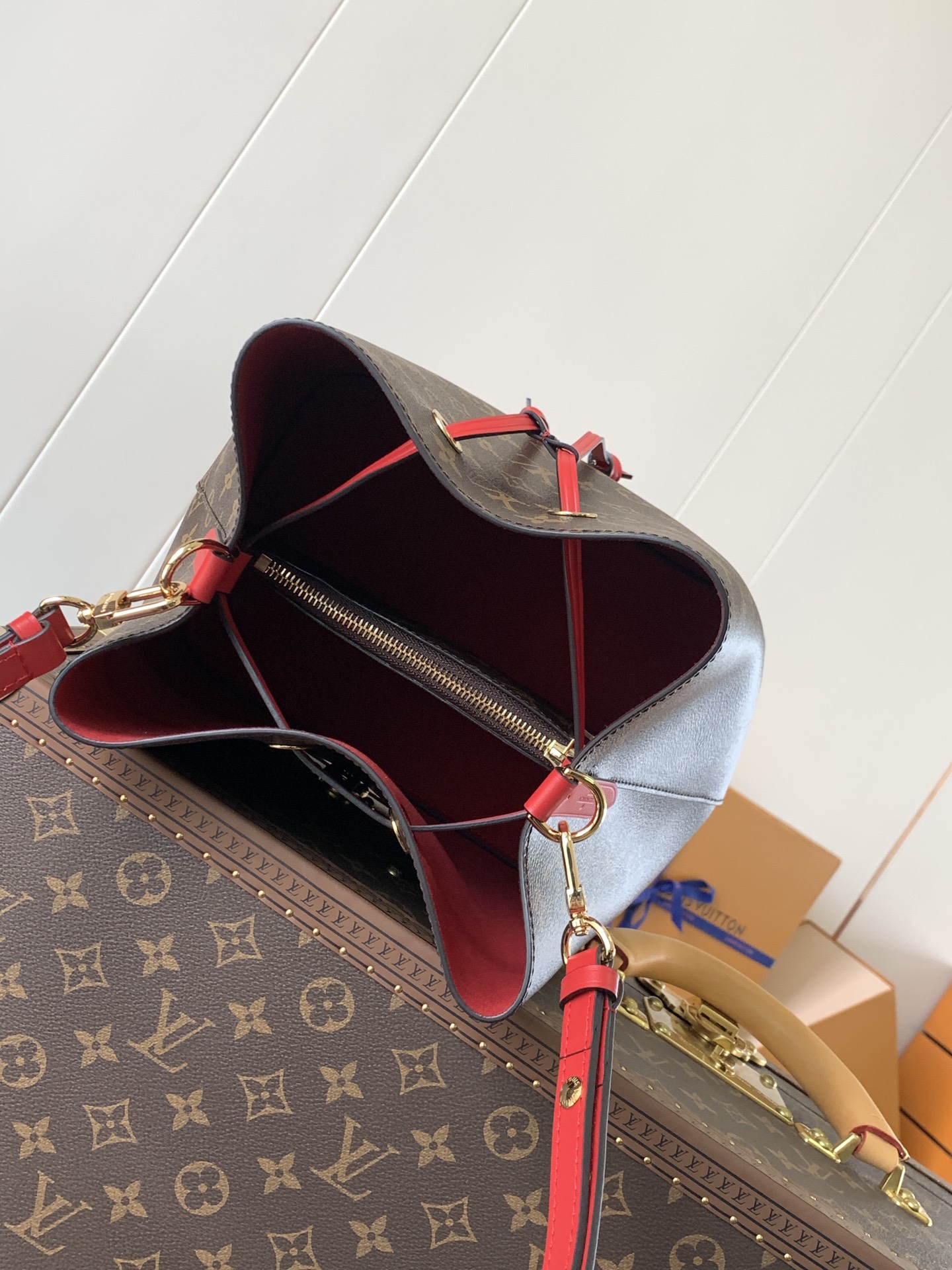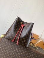 This is a replica LOUIS VUITTON M44021 NéoNoé MM. ,10.2 x 10.2 x 6.9 inches ,Coquelicot Red,Monogram coated canvas,Colored cowhide leather trim,Microfiber lining,Gold-color hardware,2 compartments,Zipped central pocket,Metal eyelets,Fits: smartphone, Victorine Compact Wallet, tissues, lipstick, earphones, keys,Strap:Removable, adjustable,Strap drop:12.2 inches,Strap drop max:21.3 inches,Handle:Single, removable