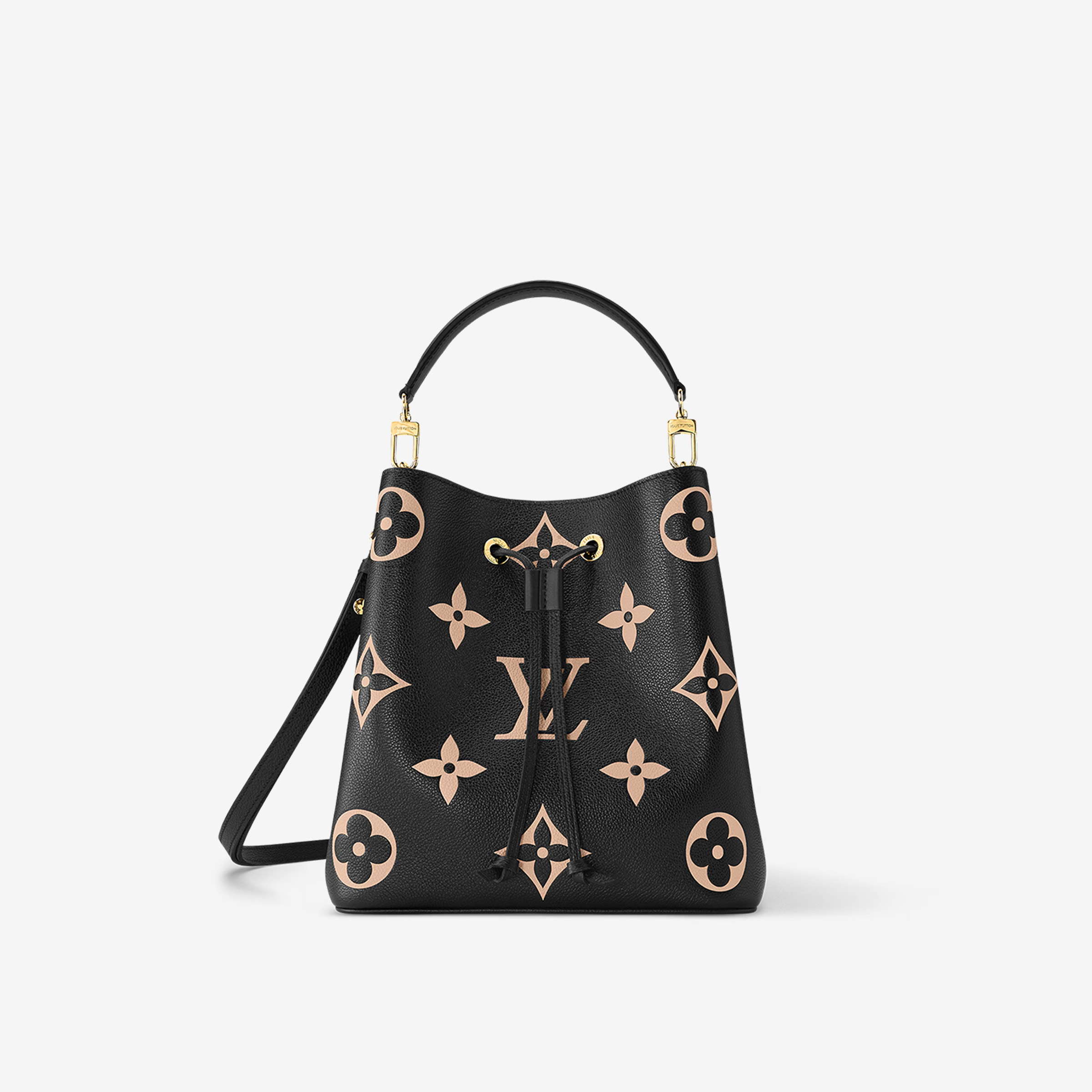 This is a replica LOUIS VUITTON M45497 NéoNoé MM. ,10.2 x 10.2 x 6.9 inches ,Black/Beige,Embossed grained cowhide leather,Grained cowhide-leather trim,Microfiber lining,Gold-color hardware,Zipped central pocket,2 compartments,Metal eyelets,Fits: Smartphone, Victorine wallet, tissue, lipstick, earphones, keys,Weight: 0.9 kg,Strap:Removable, adjustable,Strap drop:12.2 inches,Strap drop max:21.3 inches,Handle:Single, removable