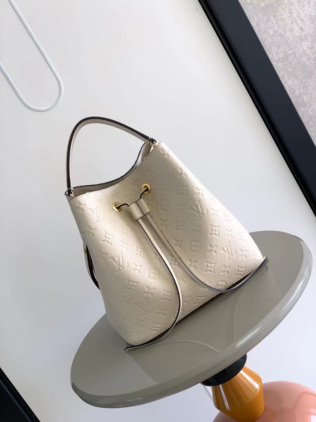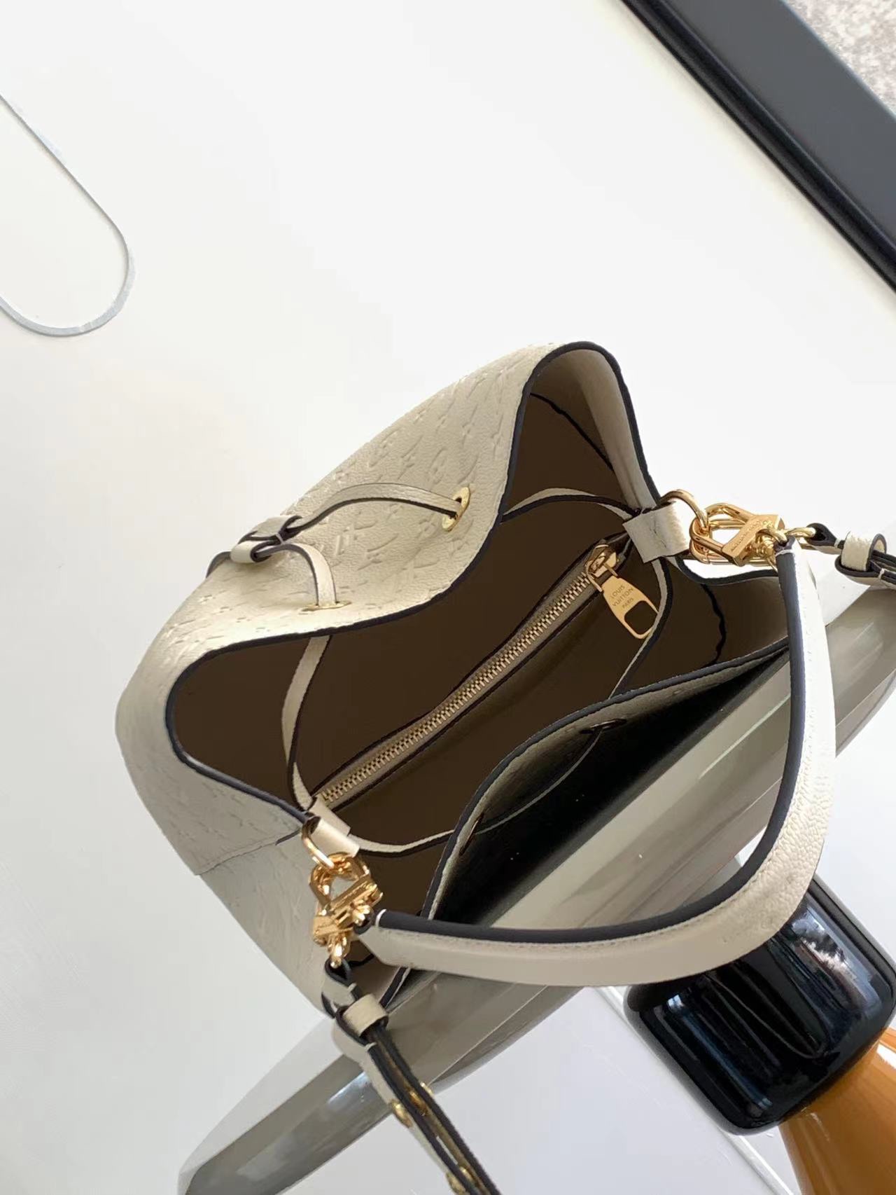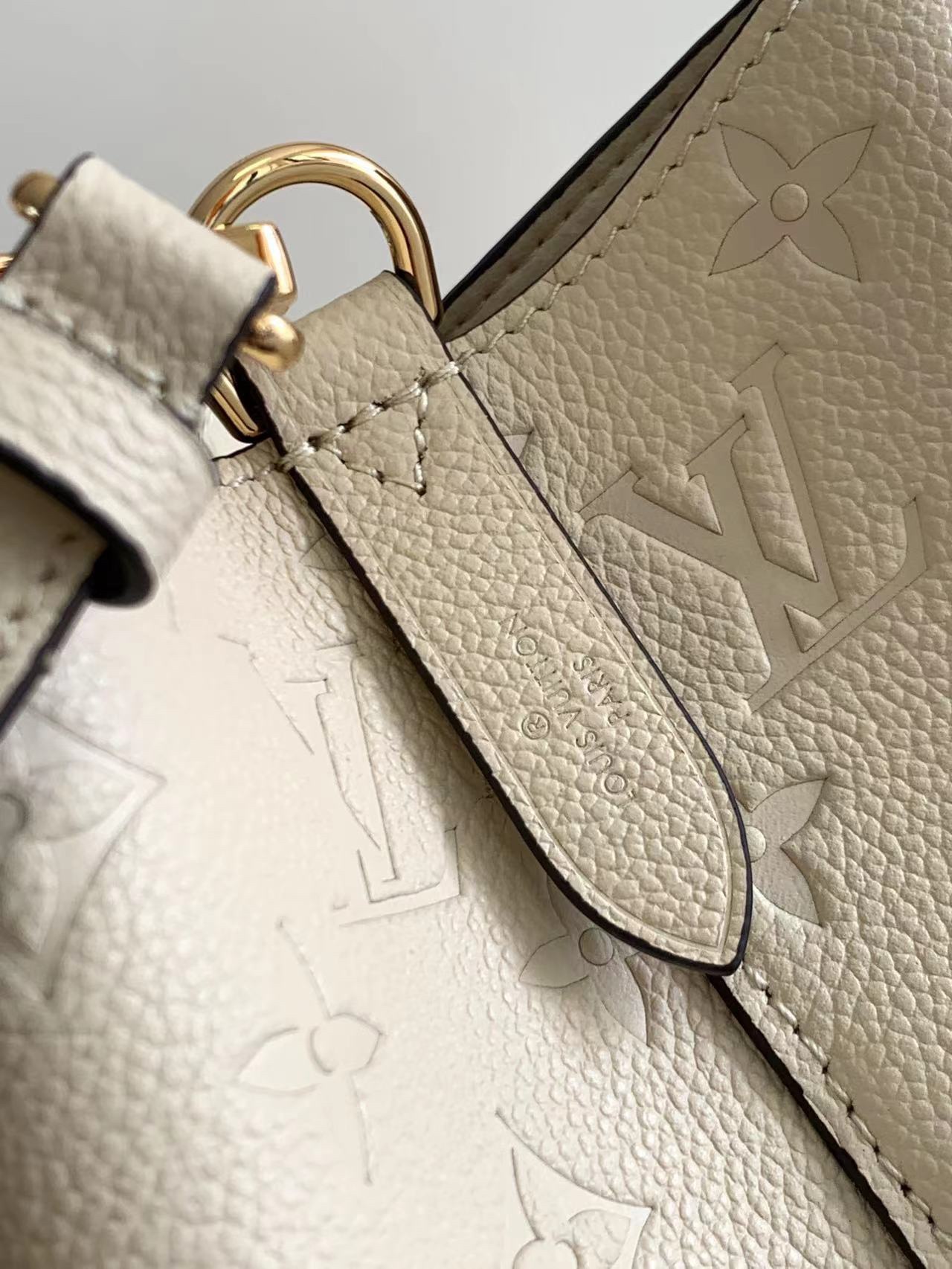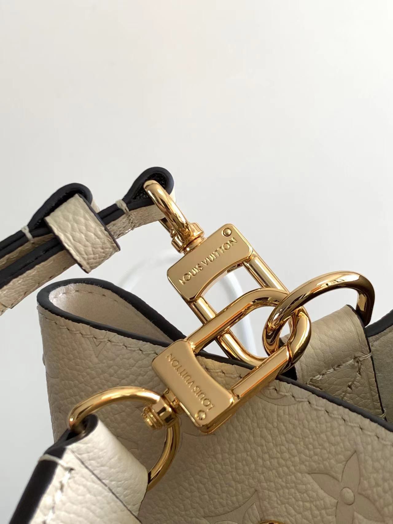This is a replica LOUIS VUITTON M46526 NéoNoé MM. ,10.2 x 10.2 x 6.9 inches ,Crème Beige,Embossed Monogram Empreinte grained cowhide leather,Cowhide-leather trim,Microfiber lining,Gold-color hardware,2 compartments,Zipped central pocket,Metal eyelets,Fits: smartphone, Victorine Compact Wallet, tissues, lipstick, earphones, keys,Strap:Removable, adjustable,Strap drop:12.2 inches,Strap drop max:21.3 inches,Handle:Single, removable