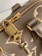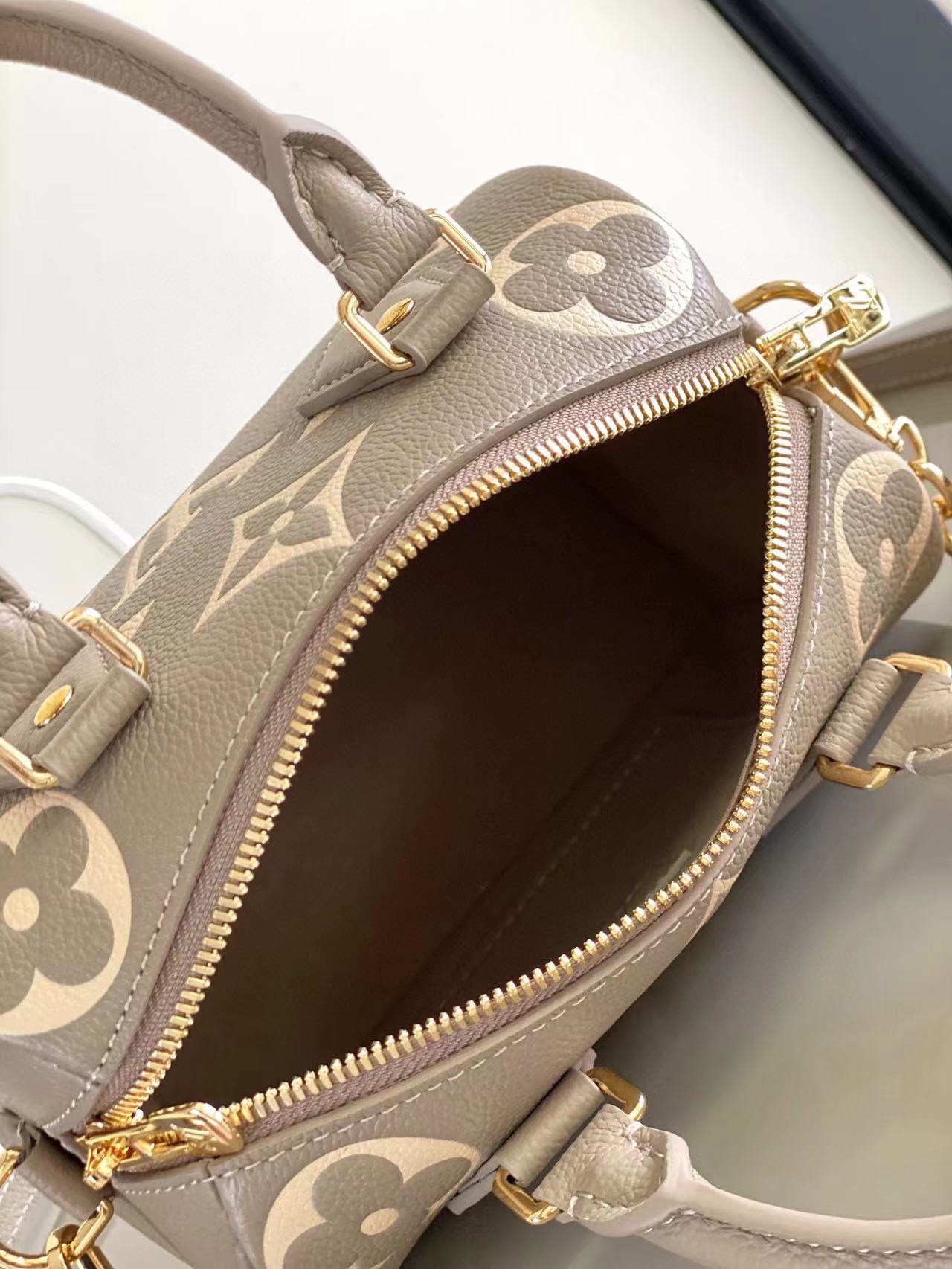 This is a replica LOUIS VUITTON M46575 Speedy Bandoulière 20. ,8.1 x 5.3 x 4.7 inches ,Tourterelle Gray / Crème Beige,Monogram Empreinte embossed grained Cowhide leather,Grained-cowhide-leather trim,Microfiber lining,Gold-color hardware,Large inside flat zipped pocket,1 inside flat pockets,Padlock,Fits: 6.7-inches smartphone, Lou Compact Wallet, keys, tissues, book, sunglasses, lipstick,Strap:Removable, adjustable,Strap drop:19.3 inches,Strap drop max:21.3 inches,Handle:Double