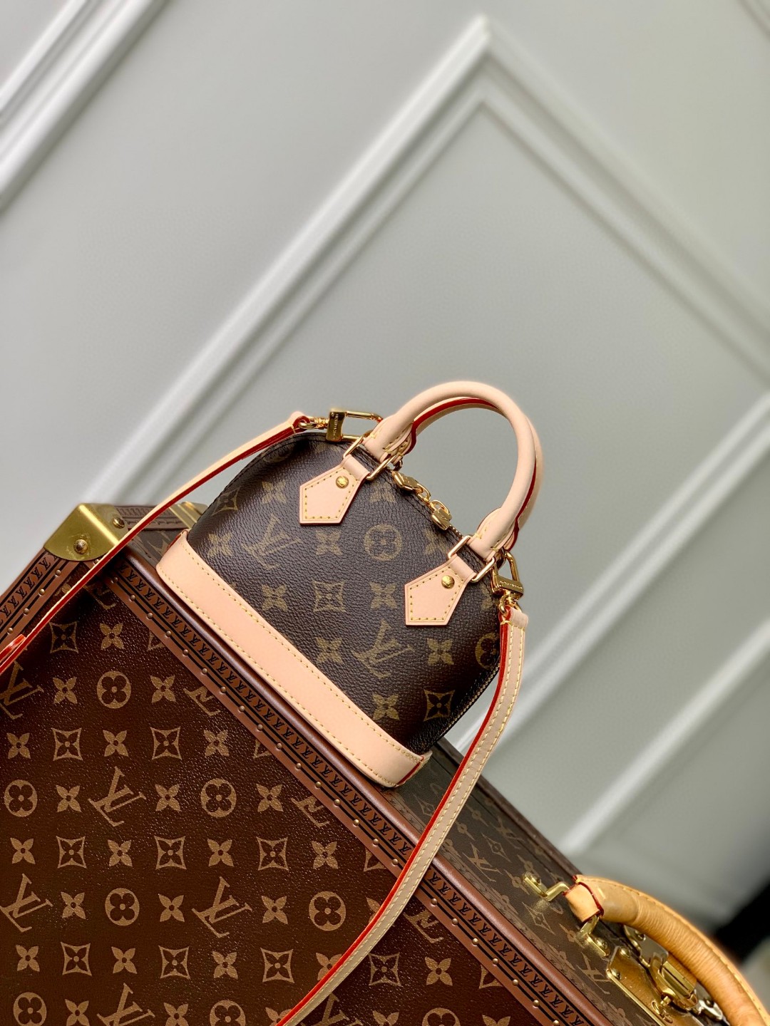 This is a replica LOUIS VUITTON M46990 Alma BB. ,9.3 x 6.9 x 4.5 inches ,Monogram coated canvas,Natural cowhide leather trim,Textile lining,Gold-color hardware,Double zip closure,Padlock,Key bell,Inside flat pocket,4 protective metal bottom studs,Fits: 6.7-inches smartphone, earphones, lipstick, tissues, keys, sunglasses,Weight: 0.5 kg,Strap:Removable, adjustable,Strap drop:19.7 inches,Strap drop max:24.4 inches,Handle:Double