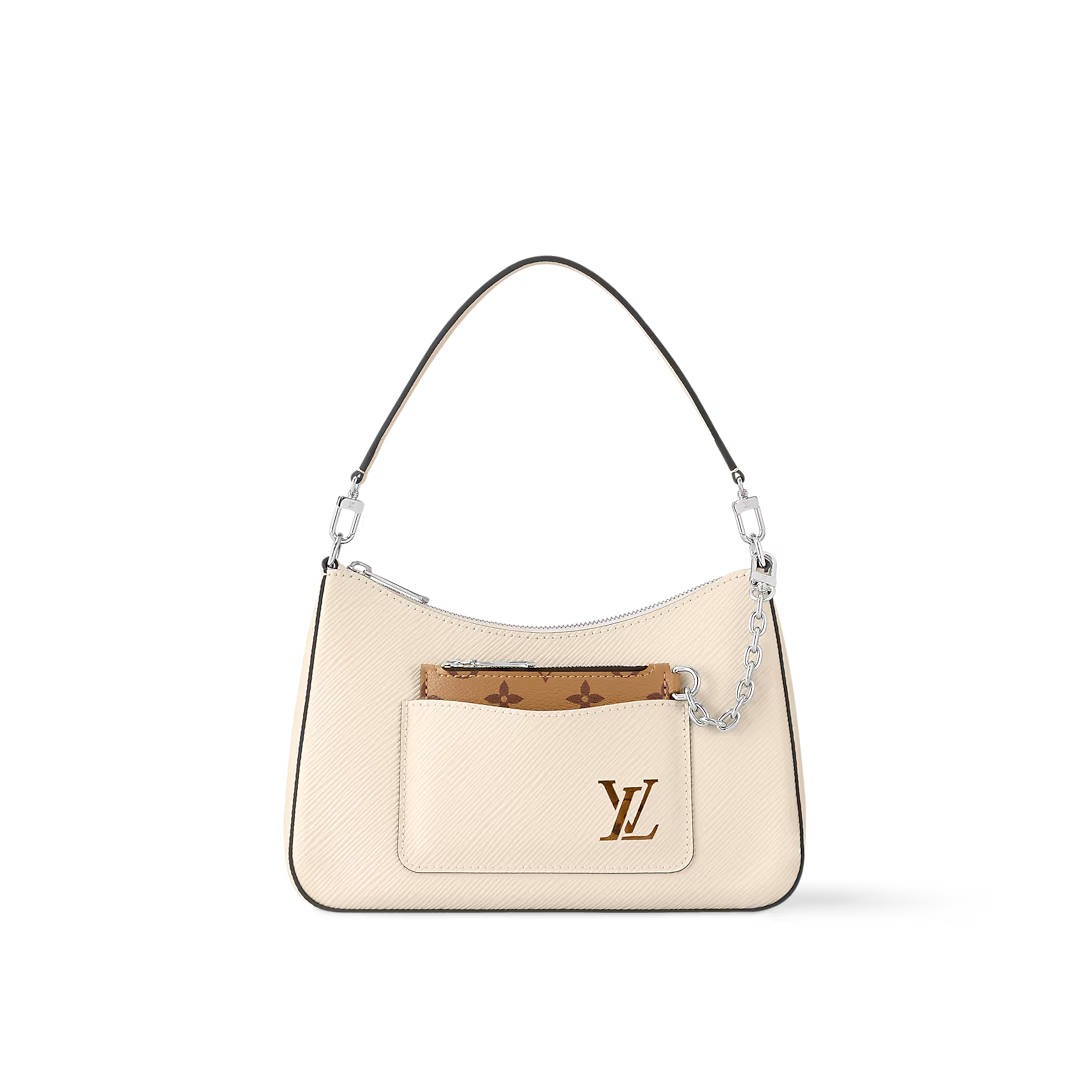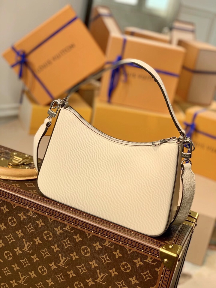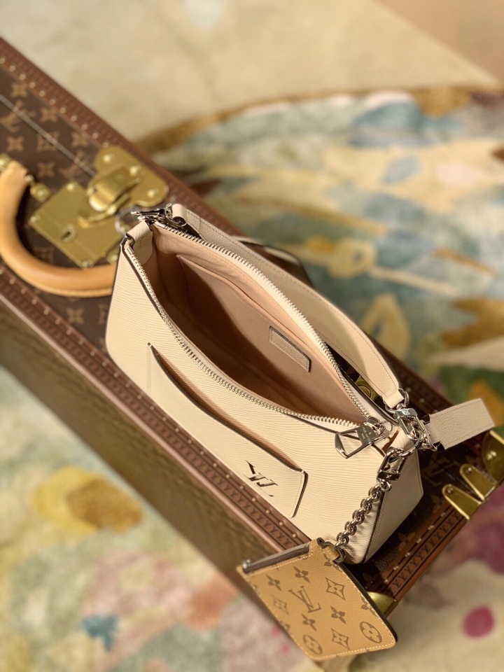 This is a replica LOUIS VUITTON M80688 Marelle Bag. ,25 x 15 x 8 cm ,Quartz White,Epi grained cowhide leather,Smooth cowhide leather and canvas trim,Microfibre lining,Silver-colour hardware,Front flat pocket,Inside large flat pocket,Strap: Removable, adjustable,Strap Drop: 47.0 cm,Strap Drop Max: 56.0 cm,Handle: Single, removable