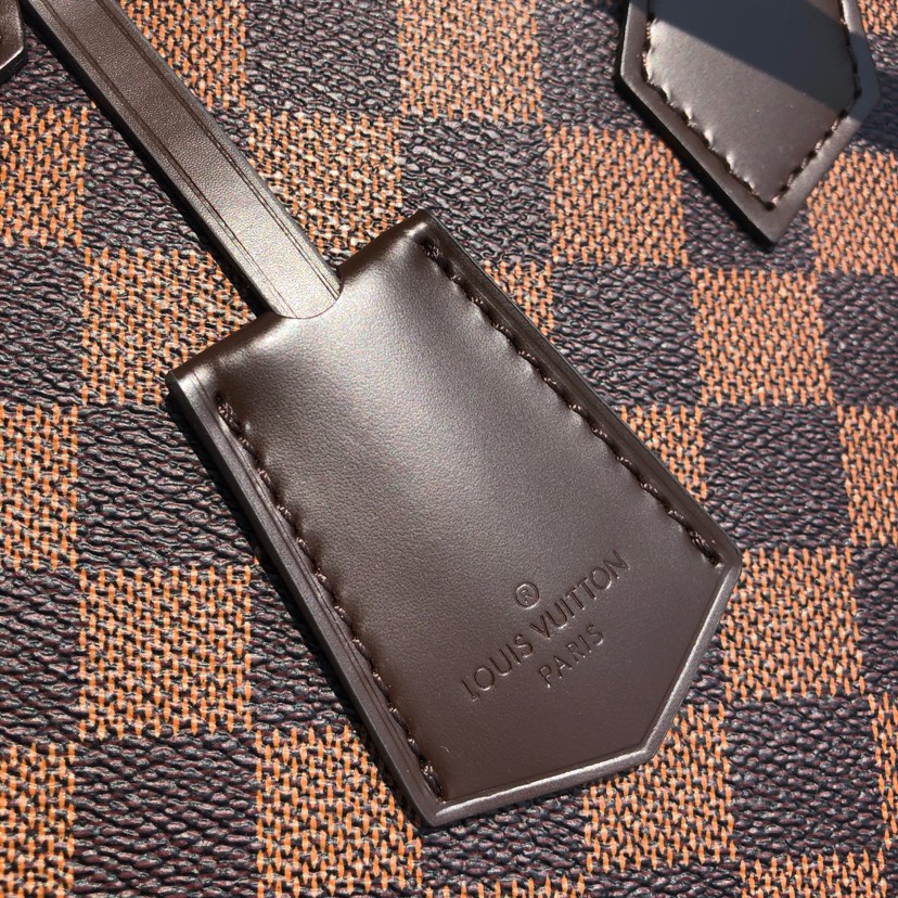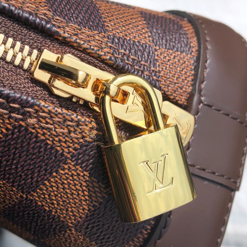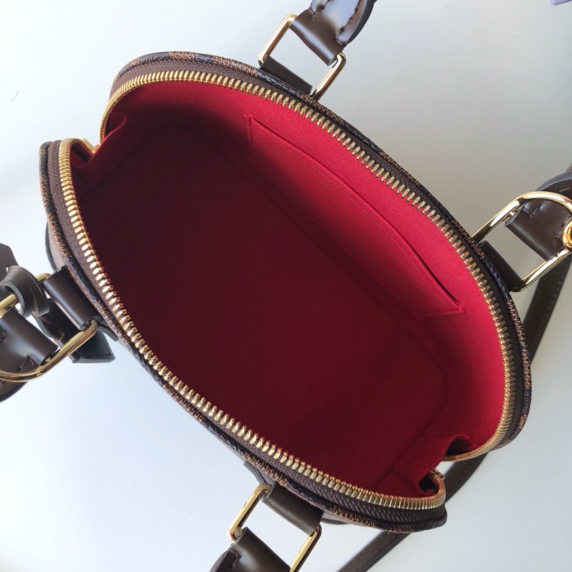 This is a replica LOUIS VUITTON N40606 Alma BB. ,9.3 x 6.9 x 4.5 inches ,Damier Ebene coated canvas,Smooth cowhide-leather trim,Textile lining,Gold-color hardware,Double zip closure,Padlock,Key bell,Inside flat pocket,4 protective metal bottom studs,Fits: 6.7-inch smartphone, earphones, lipstick, tissues, keys, sunglasses,Strap:Removable, adjustable,Strap drop:19.7 inches,Strap drop max:24.4 inches,Handle:Double
