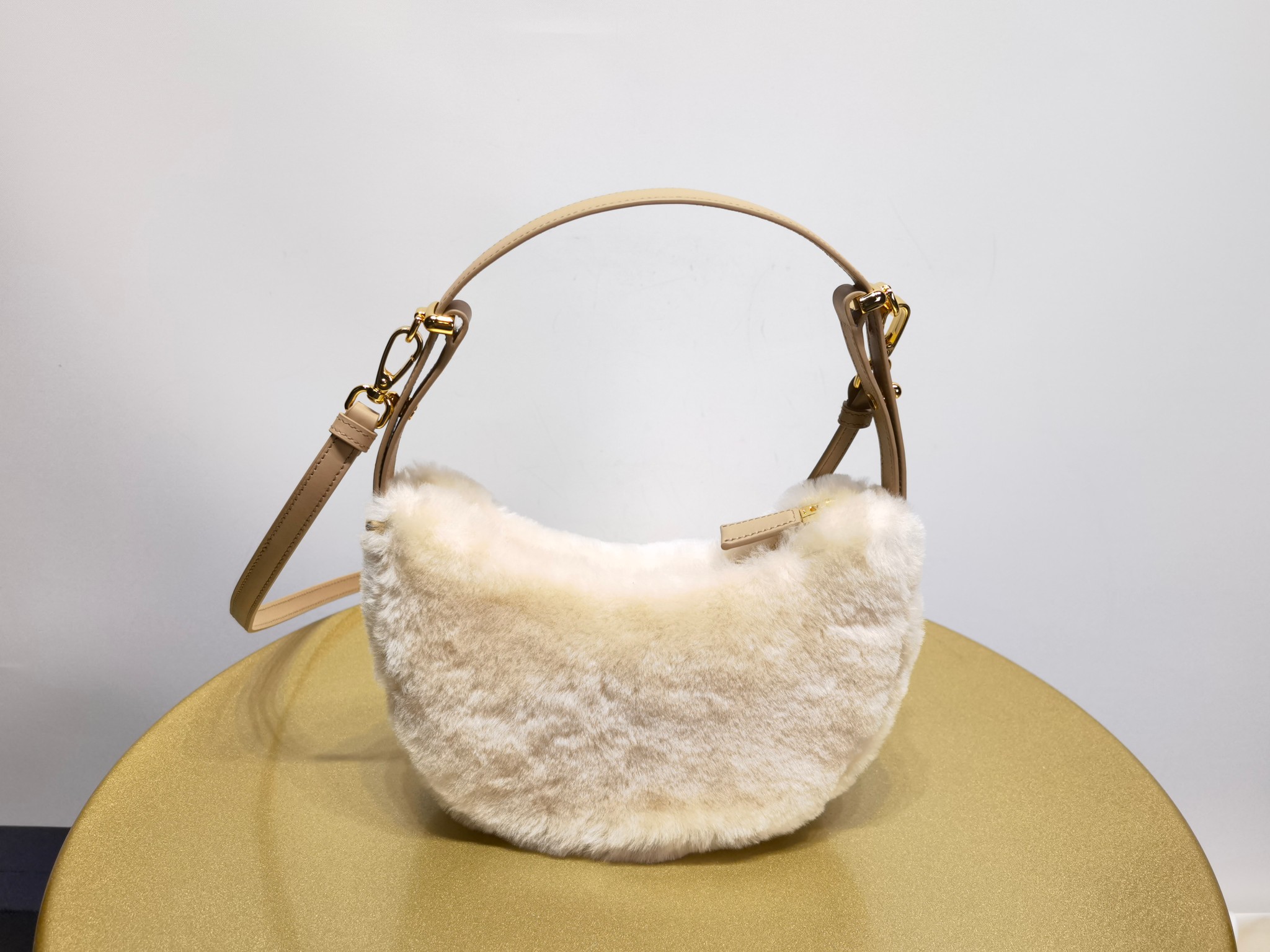 This is a replica Prada 1BC194 Arqué small shearling and leather shoulder bag. ,Detachable, adjustable leather shoulder strap, length: 90 cm. Maximum length 93 cm – Minimum length 83 cm – Maximum drop 60 cm- Minimum drop 55 cm,Metal hardware,Enameled metal triangle logo on the front,Zipper closure,Nappa leather interior with patch pocket,