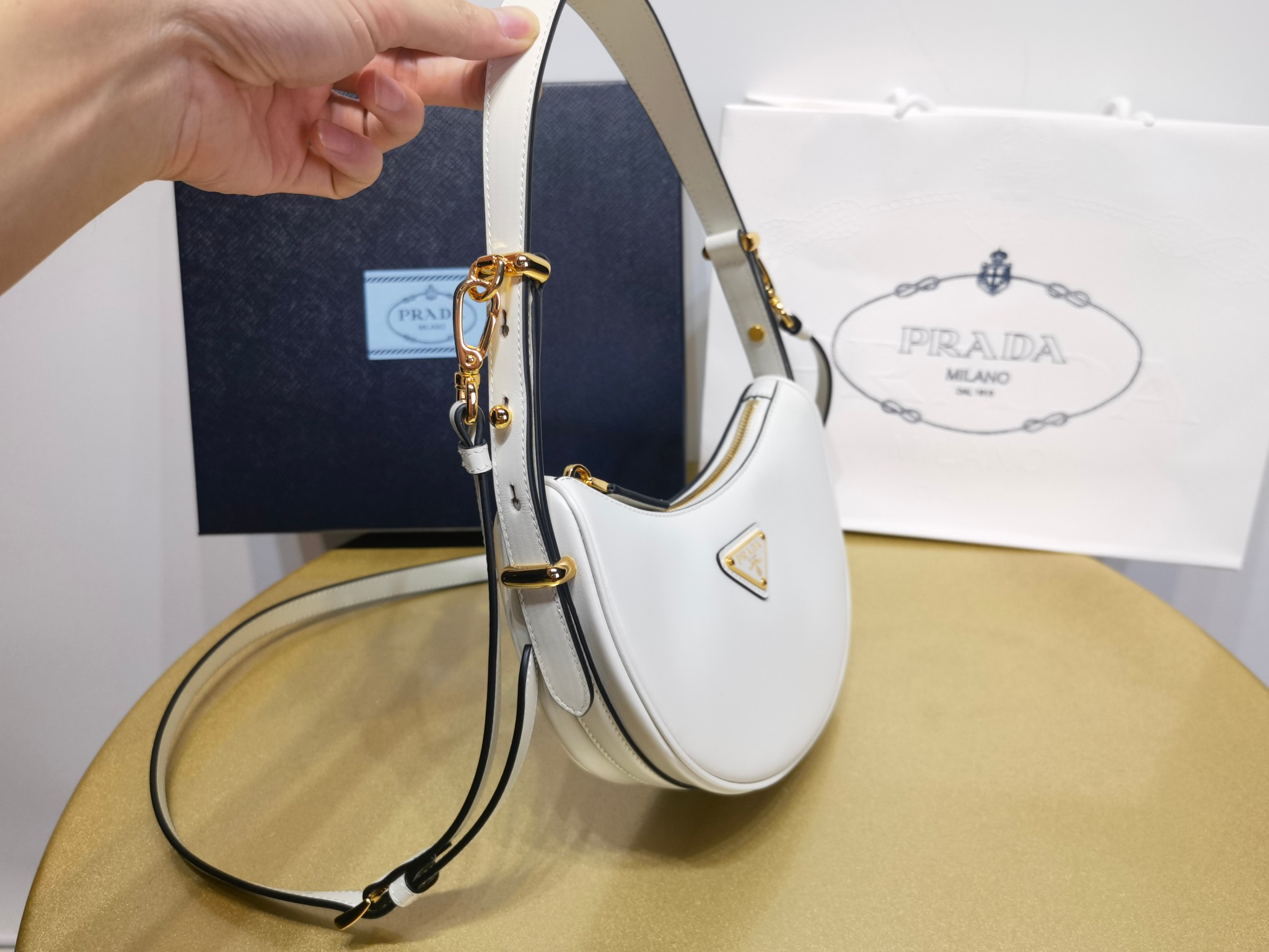 This is a replica Prada 1BC199 Arqué leather mini shoulder bag. ,Detachable, adjustable leather handle,Detachable, adjustable leather shoulder strap Maximum length: 93 cm – Minimum length: 83 cm – Maximum drop length: 60 cm – Minimum drop length: 55 cm,Metal hardware,Enameled metal triangle logo on the front,Zipper closure,Nappa leather lining with patch pocket,Height: 16cm,Width: 18cm,Length: 5cm