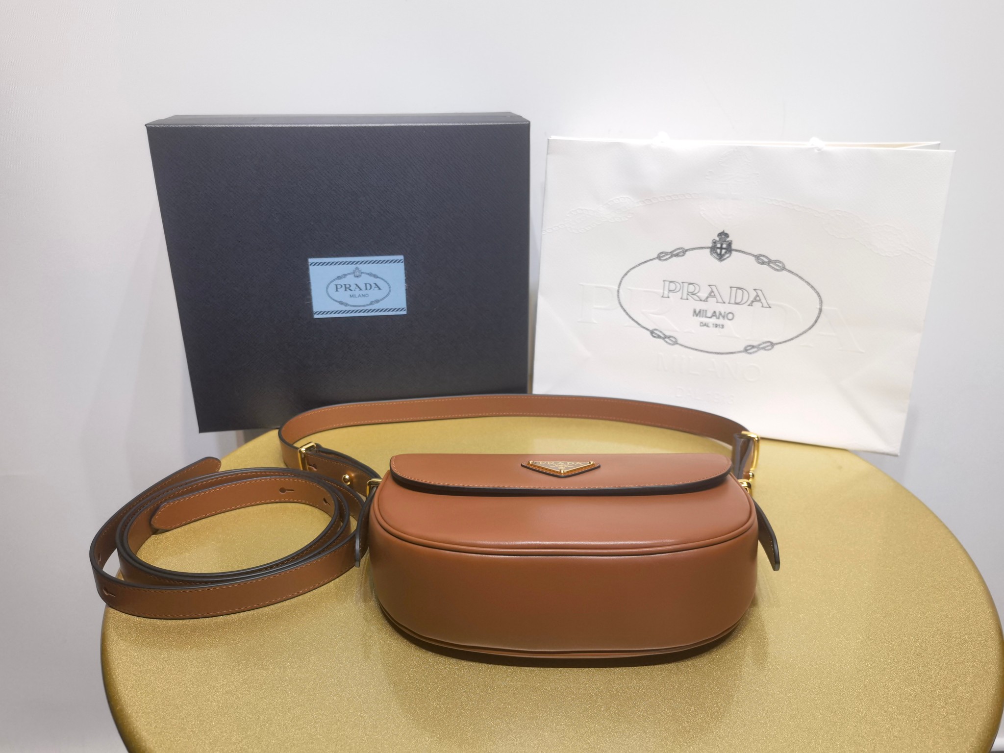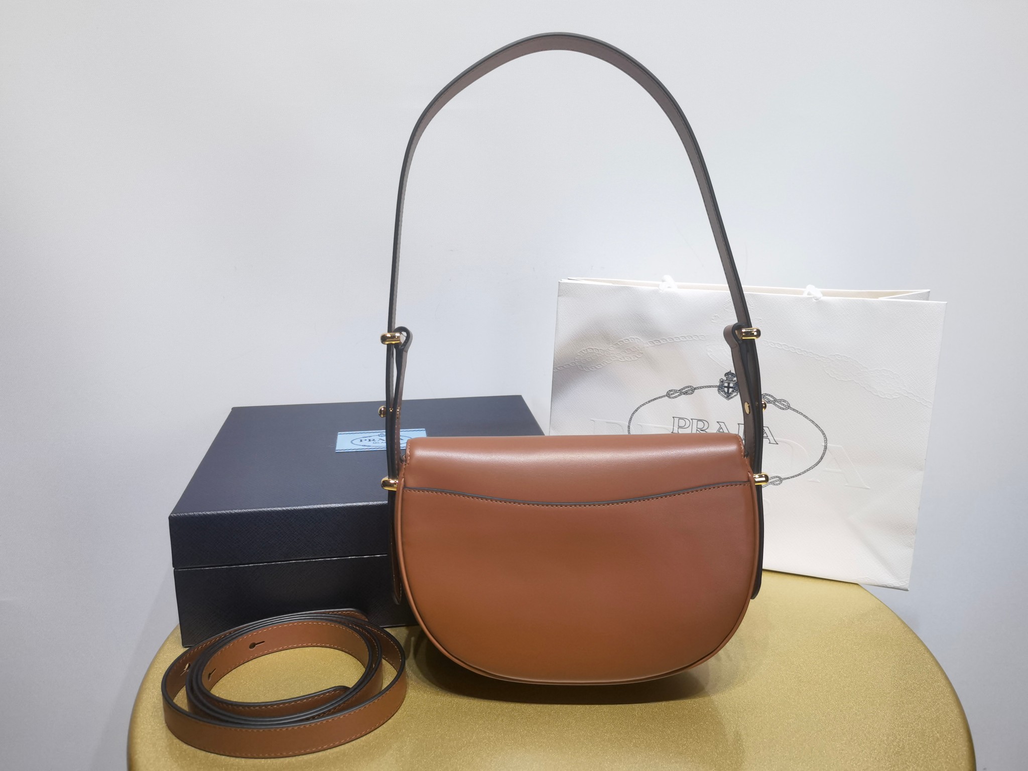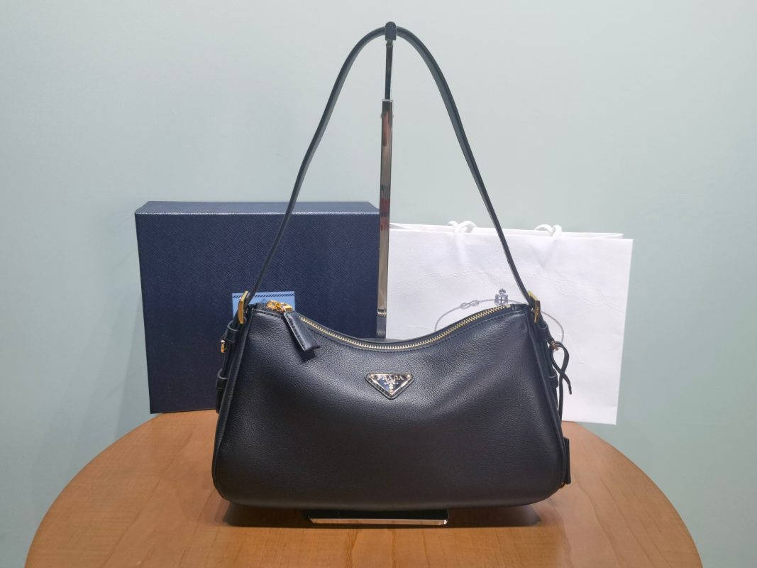 This is a replica Prada Prada 1BD365 Arqué leather shoulder bag with flap. ,Leather handle with extension for cross-body use,Extendible shoulder strap Maximum length 122 cm – Minimum length 56 cm – Maximum drop 56 cm – Minimum drop 23 cm,Metal hardware,Enameled metal triangle logo on the flap,Magnetic closure on the flap,Nappa leather interior with patch pocket,