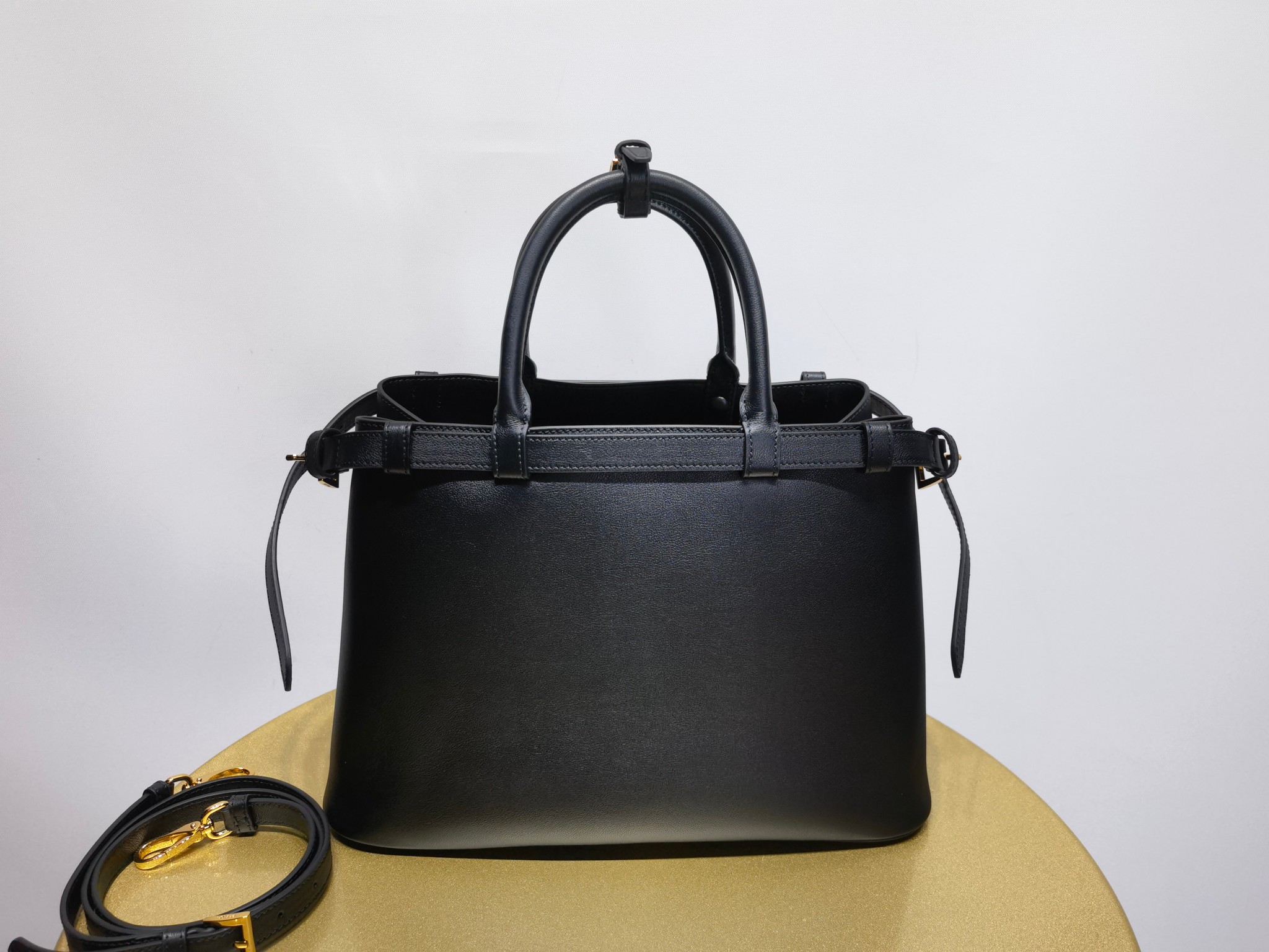 This is a replica Prada Buckle 1BA417 Medium Leather Drawstring Bag. ,Decorative buckle strap,Leather handle,Removable and adjustable leather shoulder strap Maximum length 110 cm – Minimum length 100 cm – Maximum drop 55 cm – Minimum drop 50 cm,Metal hardware accessories,Front printed lettering logo,Nappa leather lining with middle pocket,