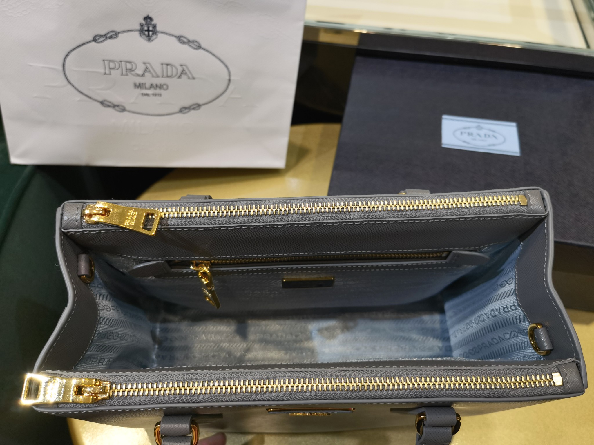 This is a replica Prada Galleria 1BA863 medium leather bag. ,Leather handles,Detachable, adjustable leather shoulder strap. Max. length: 120 cm – Min. length: 110 cm – Max. drop length: 60 cm – Min. drop length: 55 cm,Removable leather key ring,External zipper pockets,Metal hardware,Leather triangle with metal lettering logo on the front,Snap closure on the sides,Logo-print nylon lining with two pockets, including one with zipper,With purse feet,Height: 19.5cm,Width: 28cm,Length: 12cm
